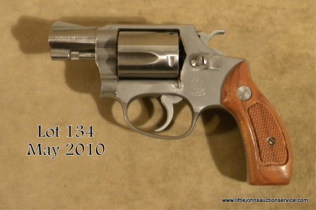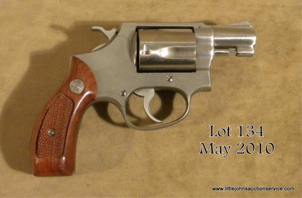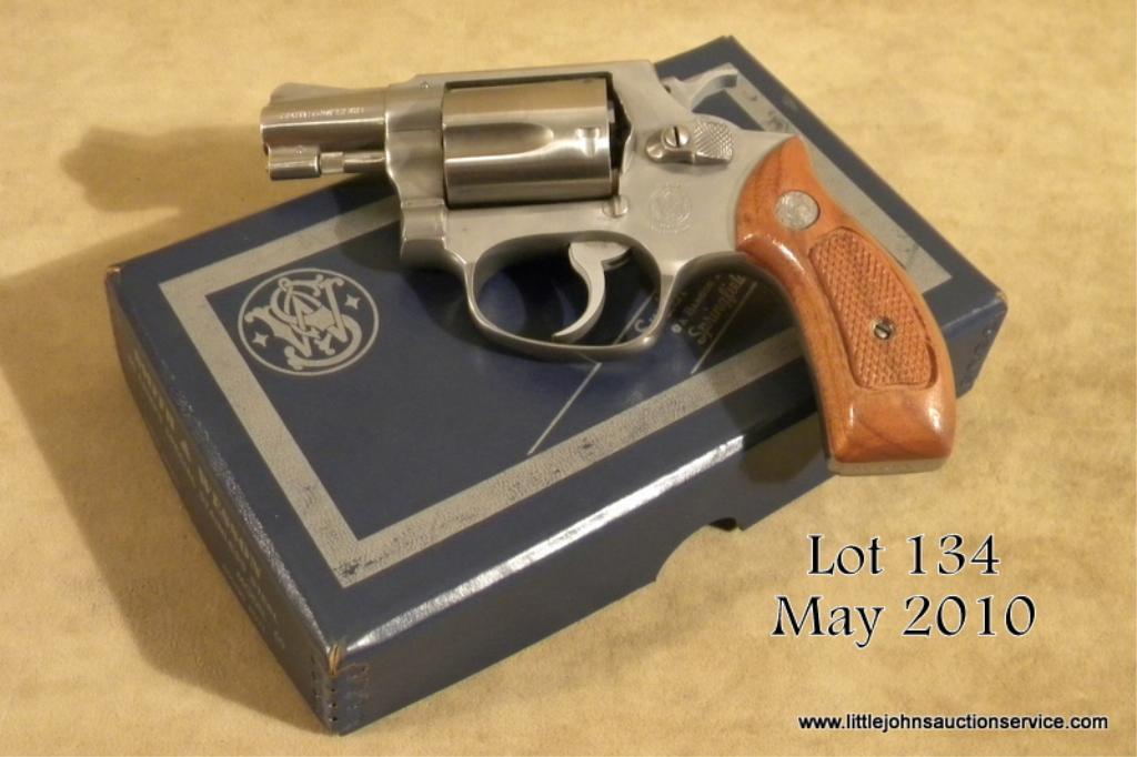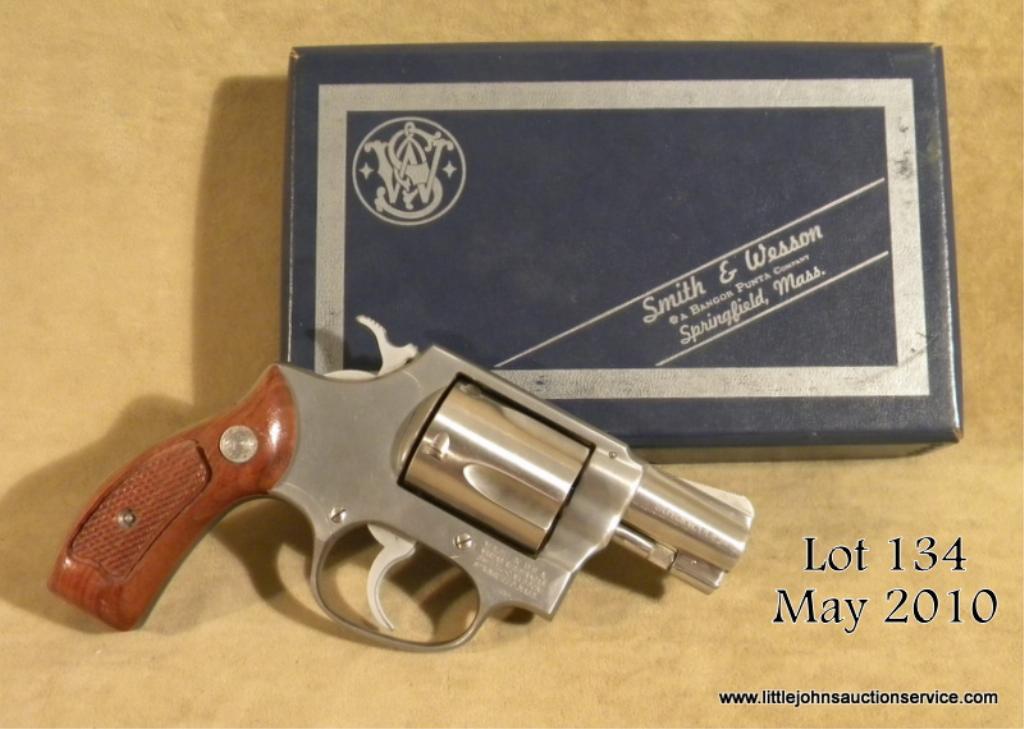 SMITH & WESSON Model 60, # R3842, .38 cal, 2" barrel, stainless with checkered medallion grips and original box. Revolver is in very good condition showing slight scratches, bore is very good, and gun will improve with cleaning.Original box is numbered to the gun, and includes original papers and cleaning rod. Est. $200-$400.