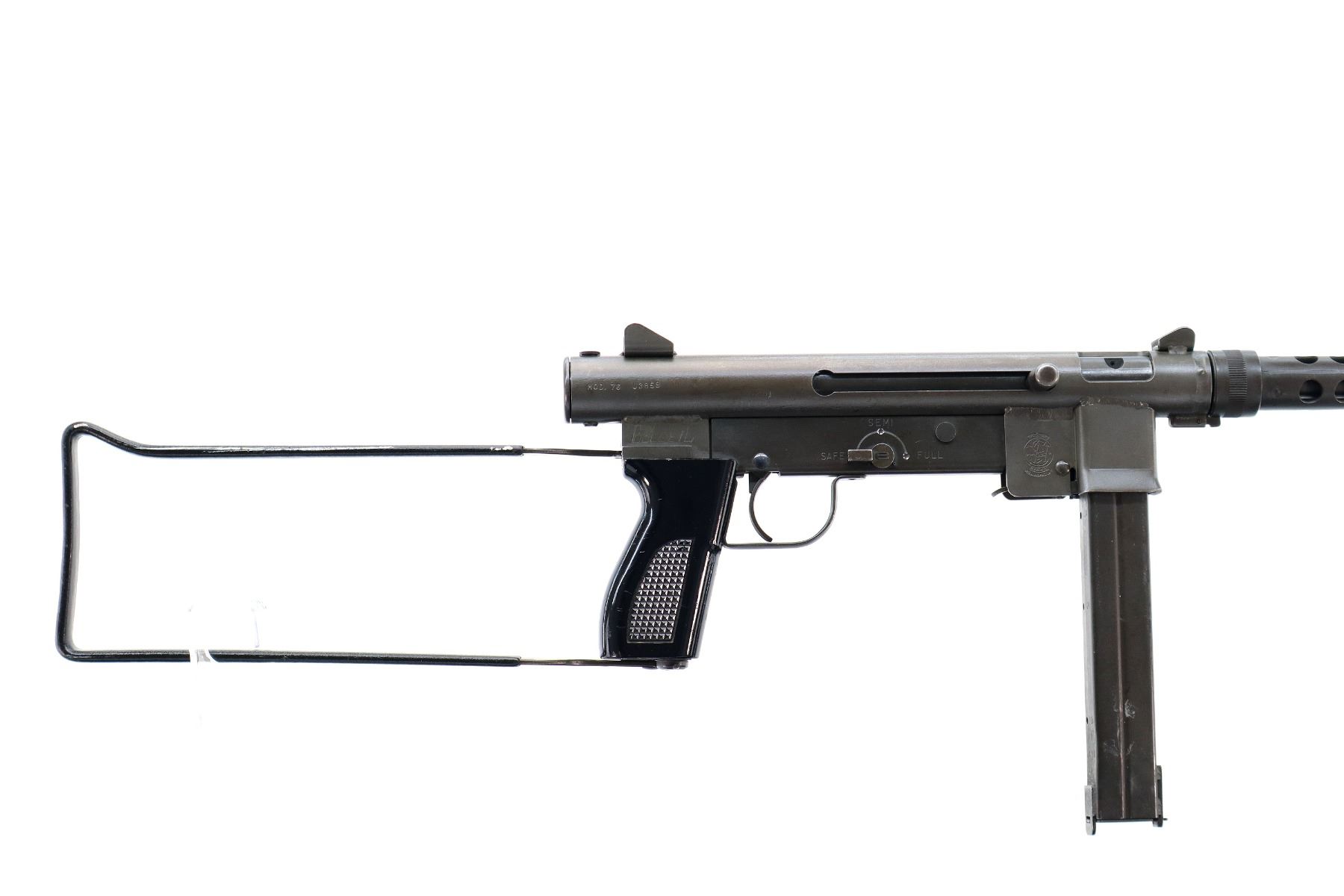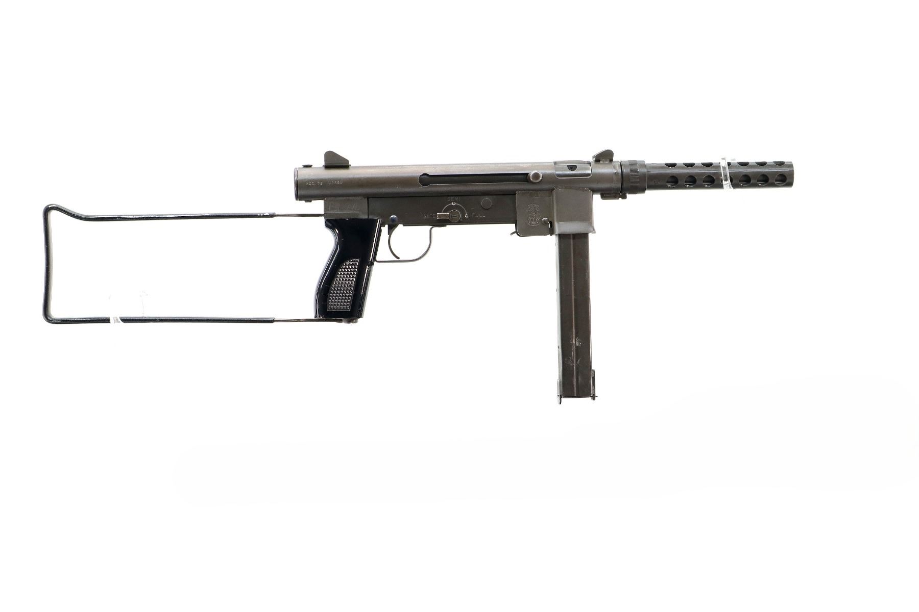 Main Description: 12-2 Prohibited, Post front sight with ears, fixed rear peep sight with ears, Parkerized metal finish, ventilated barrel shroud, grooved cocking handle. One piece checkered black polymer grip, folding Loop butt stock with black polymer cover, sling swivels. This Firearm can only be transferred to a Business or Museum also can be deactivated.