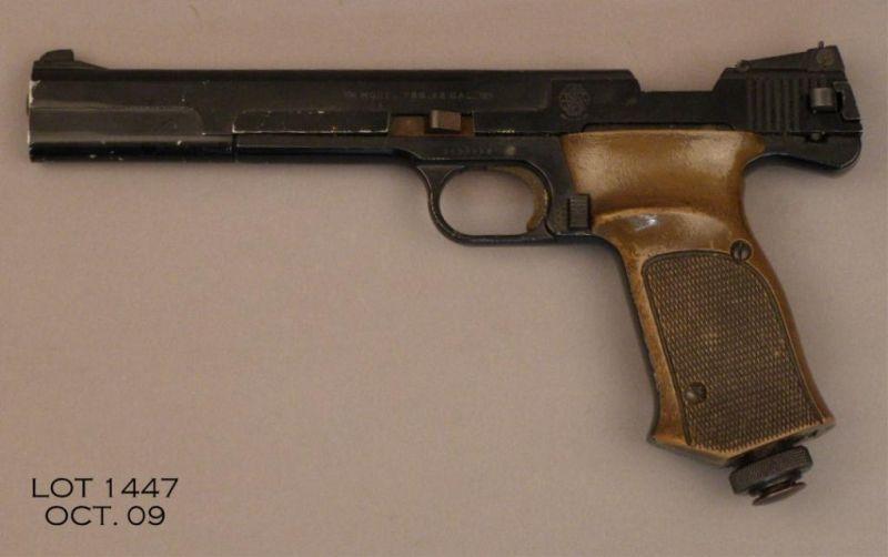 SMITH & WESSON Model 78G, .22 cal CO-2 pellet gun, #Q004958, in overall fair to good condition, adjustable sights. Right grip panel has a 1" x 1.25" piece missing from the bottom. "Jake Garman" crudely inscribed in the butt. Est.$25-$50.