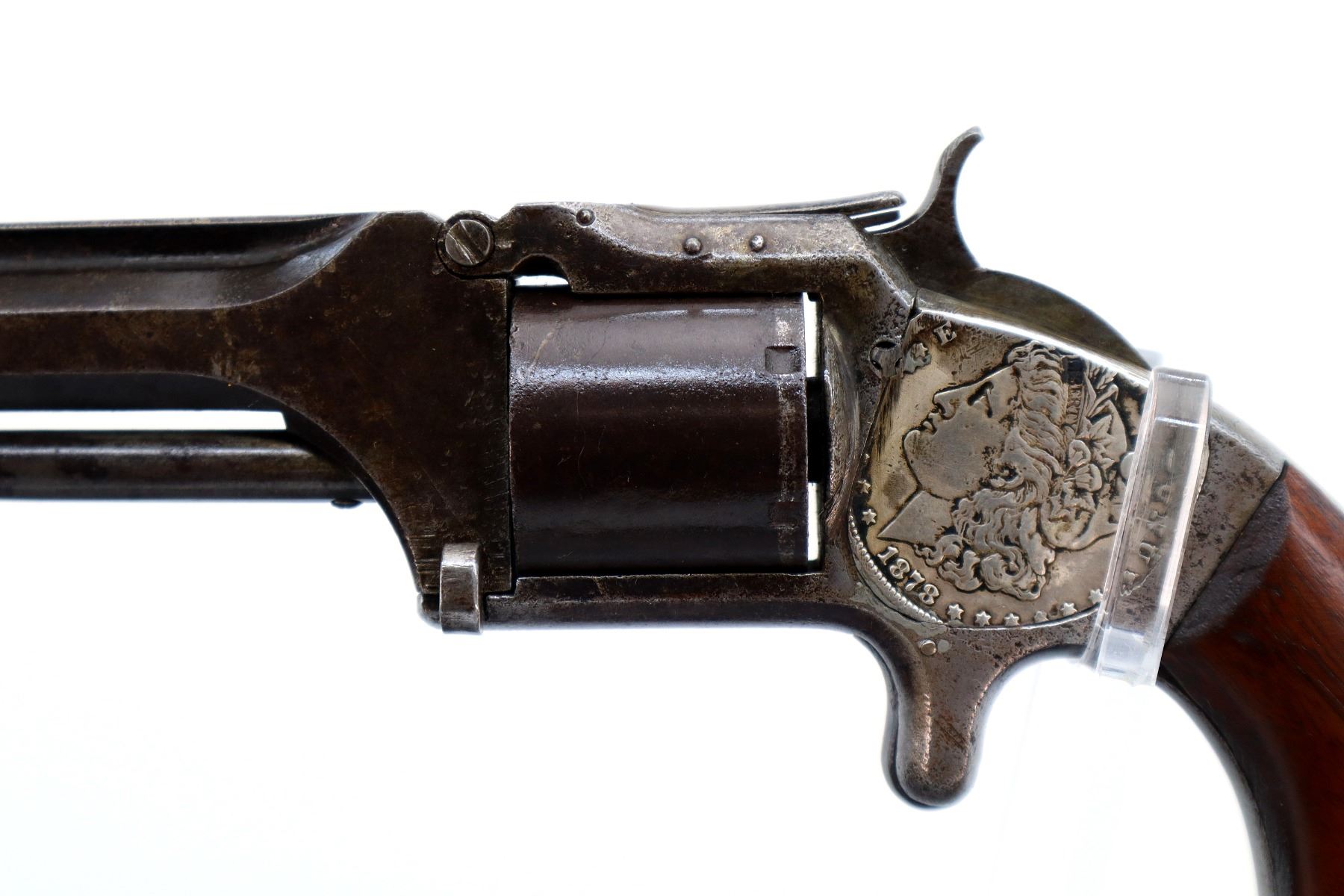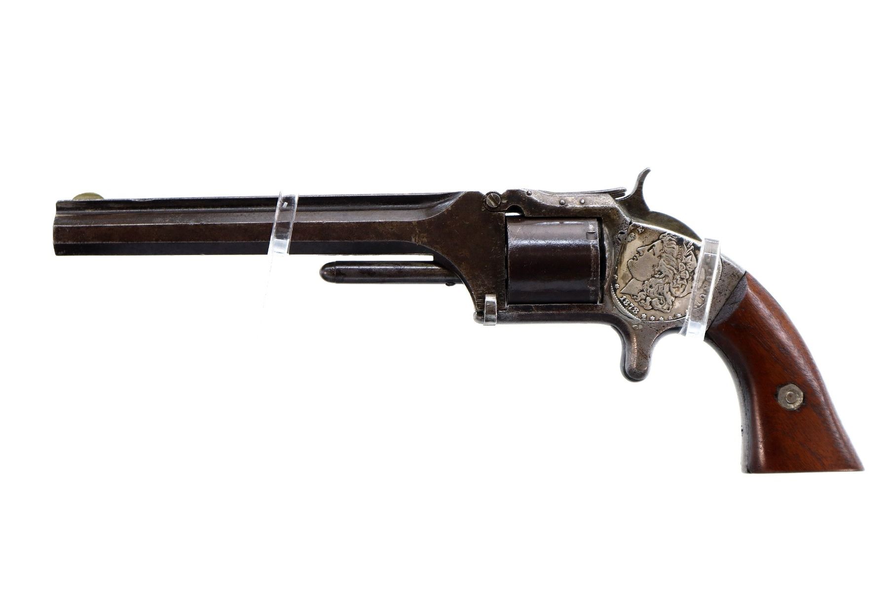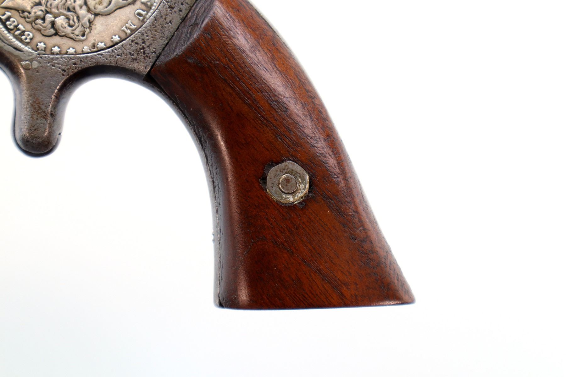 Main Description: Functions mechanically as designed, Cocks but does not Index. Blade front sight, octagon barrel with solid rib, slightly loose on the frame, smooth cylinder, left side plate replaced with a US 1878 coin, screw is broken, checkered spur hammer and smooth trigger. Two piece smooth wood grips with replaced mounting screw.