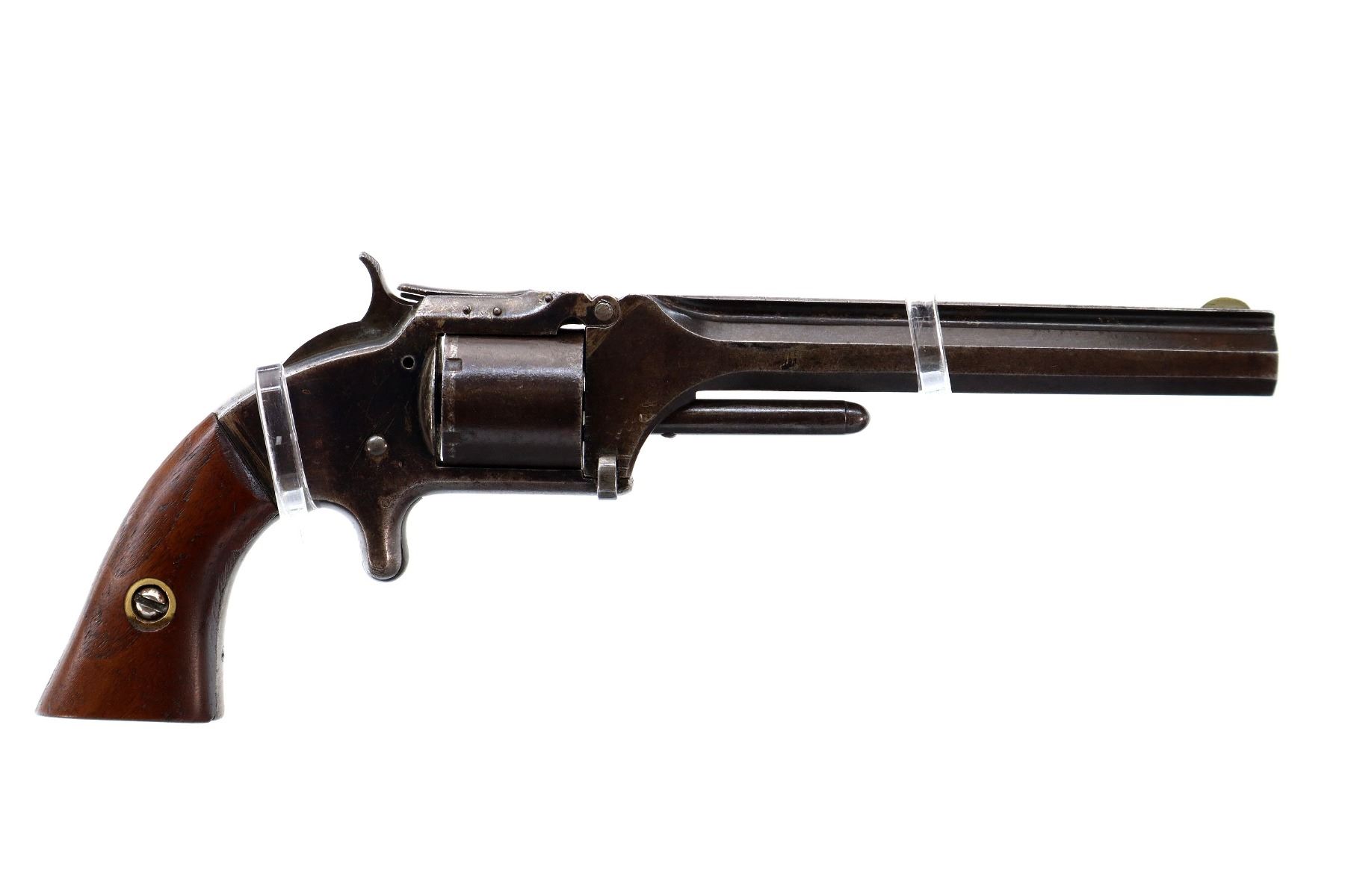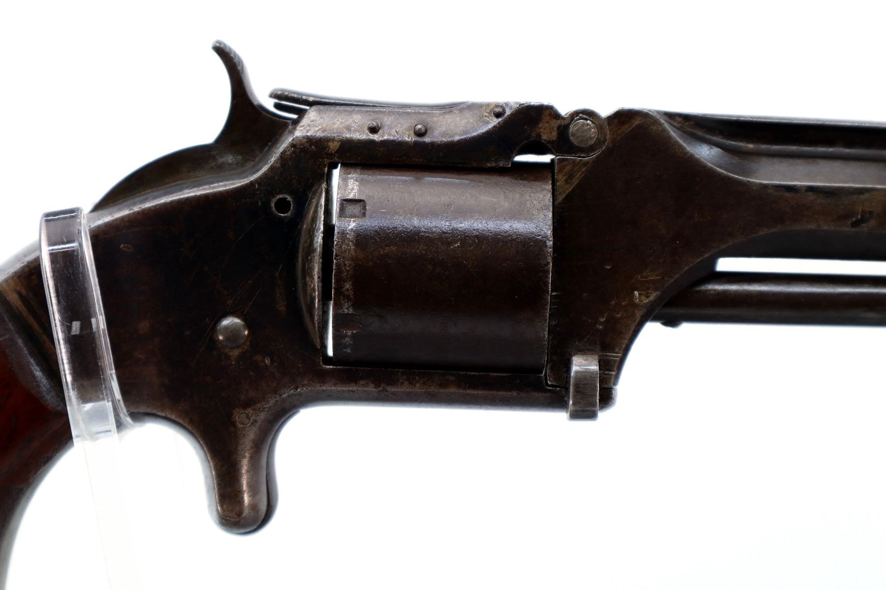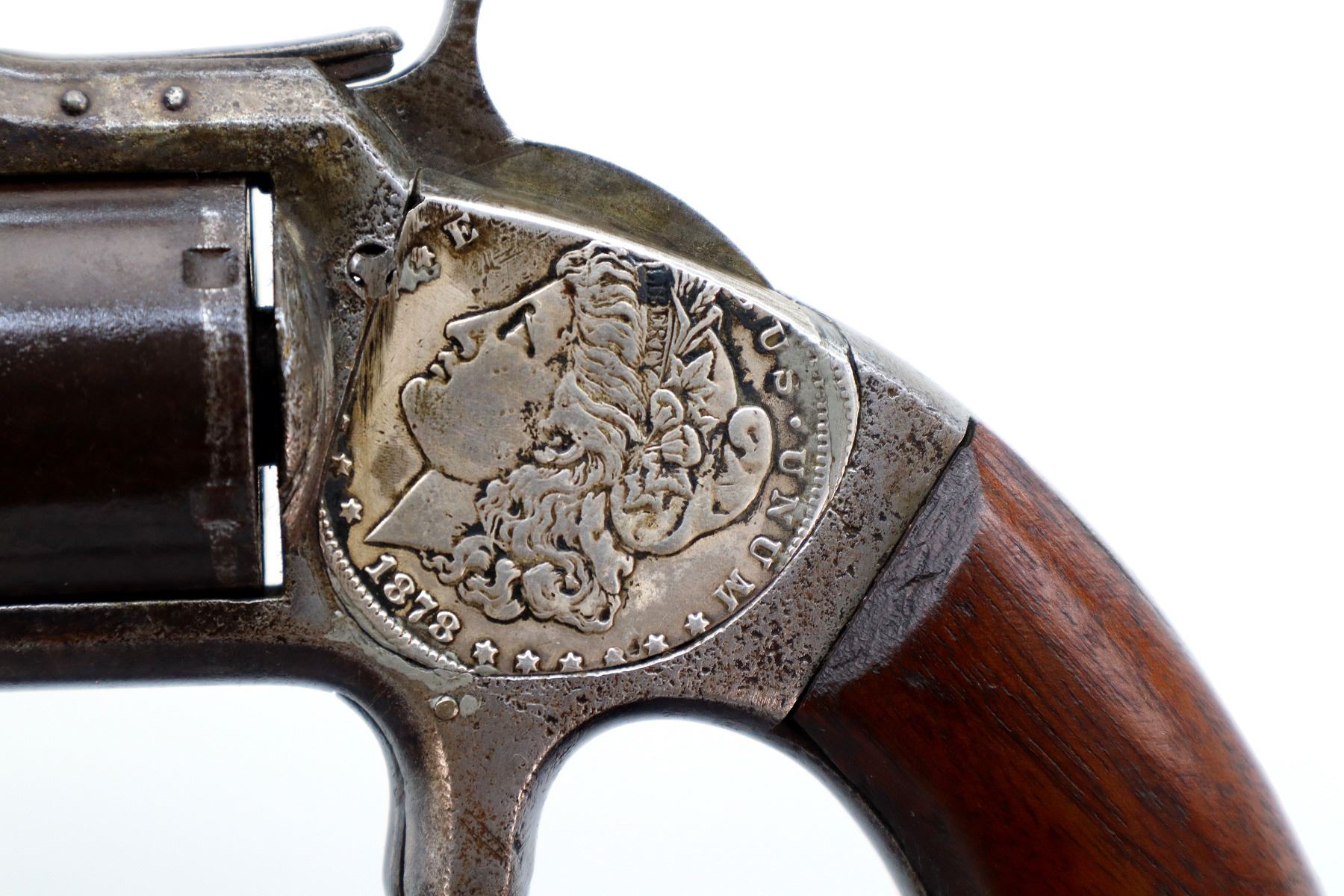 Main Description: Functions mechanically as designed, Cocks but does not Index. Blade front sight, octagon barrel with solid rib, slightly loose on the frame, smooth cylinder, left side plate replaced with a US 1878 coin, screw is broken, checkered spur hammer and smooth trigger. Two piece smooth wood grips with replaced mounting screw.