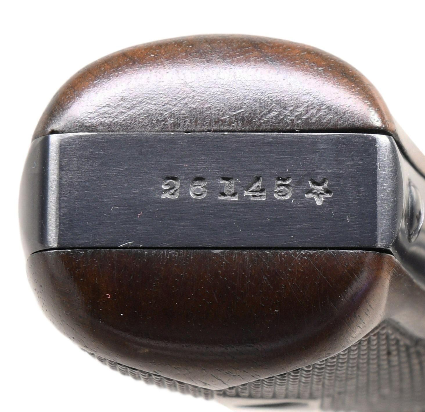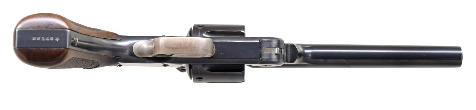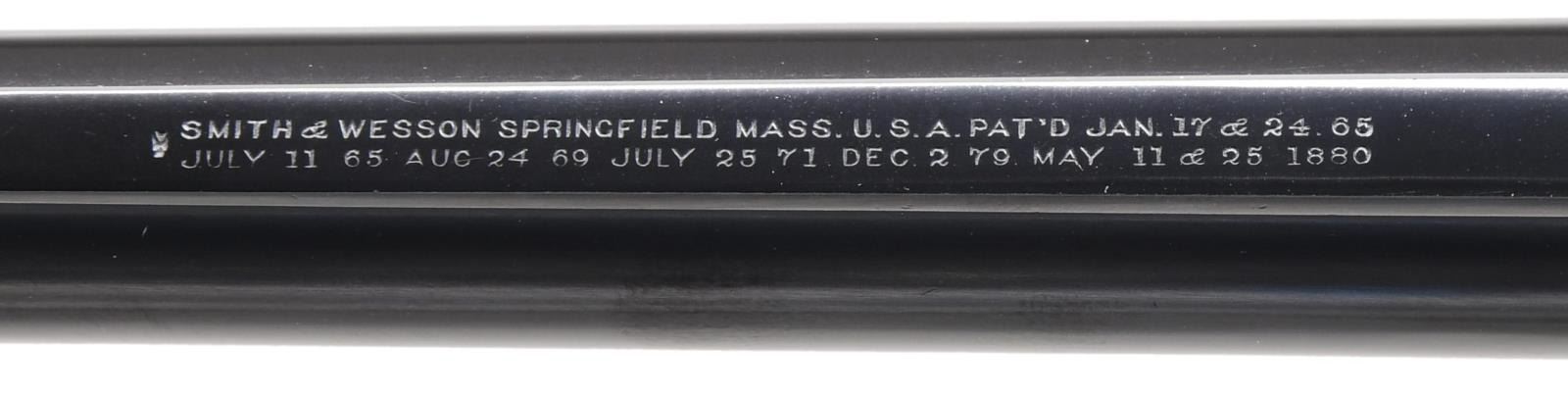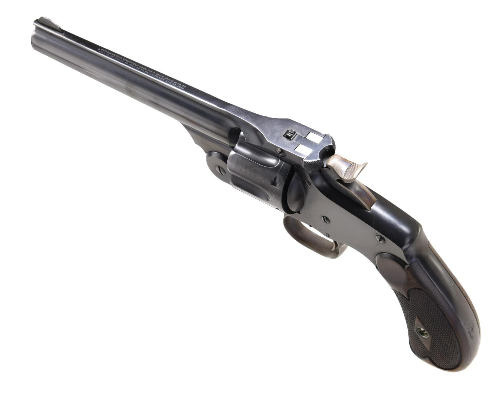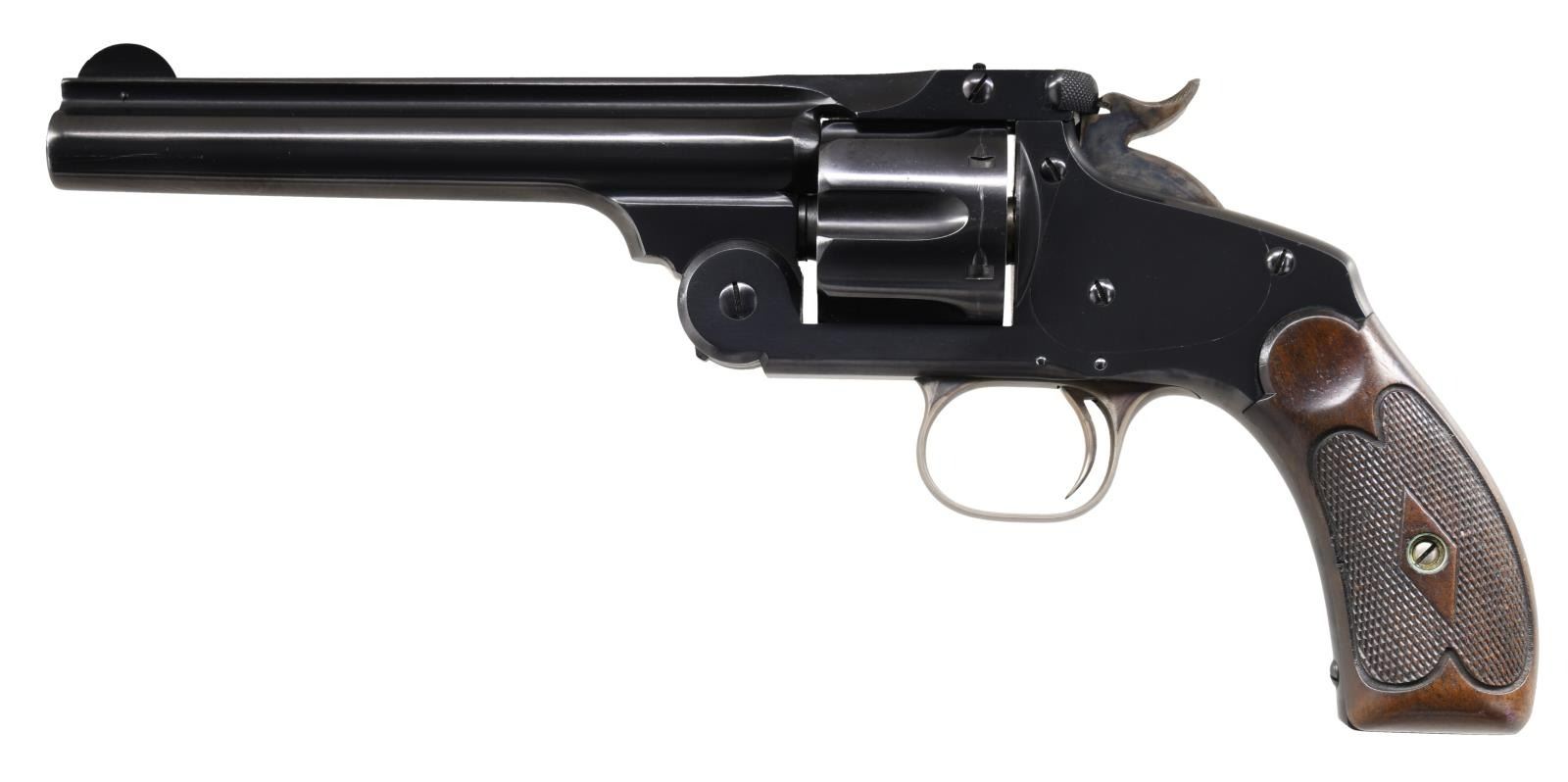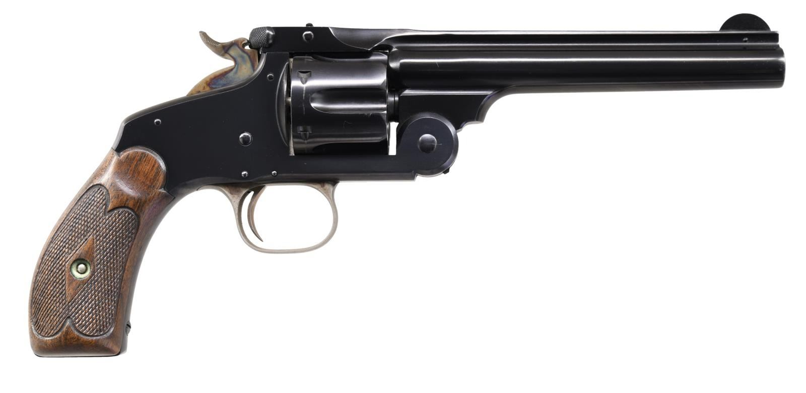 "REVENUE CUTTER" DA REVOLVER. Cal. 44-40. S# 26145. Bbl. 6" round w/ rib & semi-circular sight. Six shot fluted cyl. Top break action. Blue finish w/ case colored hammer & trigger guard. Bright finished hammer. 2 piece checkered walnut grips. Left side under grip is marked w/ diamond & 5 24 date. Butt of gun after serial number has star marking. UNATTACHED ACCESSORIES: letter from Smith & Wesson detailing the following information, "Your revolver, serial number 26145, was one of the New Model Number 3s supplied to the United States for the Coast Guard and records indicate this was shipped on June 27, 1890 from our factory. / The diamond shape marking is a refinishing mark and the numbers 5, 24 is a representation that this work was performed in May, 1924.". CONDITION: near excellent as factory restored retaining 98% blue showing a light cyl. drag line & small marks. 90% fading case colors. Grips have lightly worn checkering. Sound action. PROVENANCE: The Collection of Edward Scott Meadows. (01-24721/DS). ANTIQUE. $3,000-5,000.