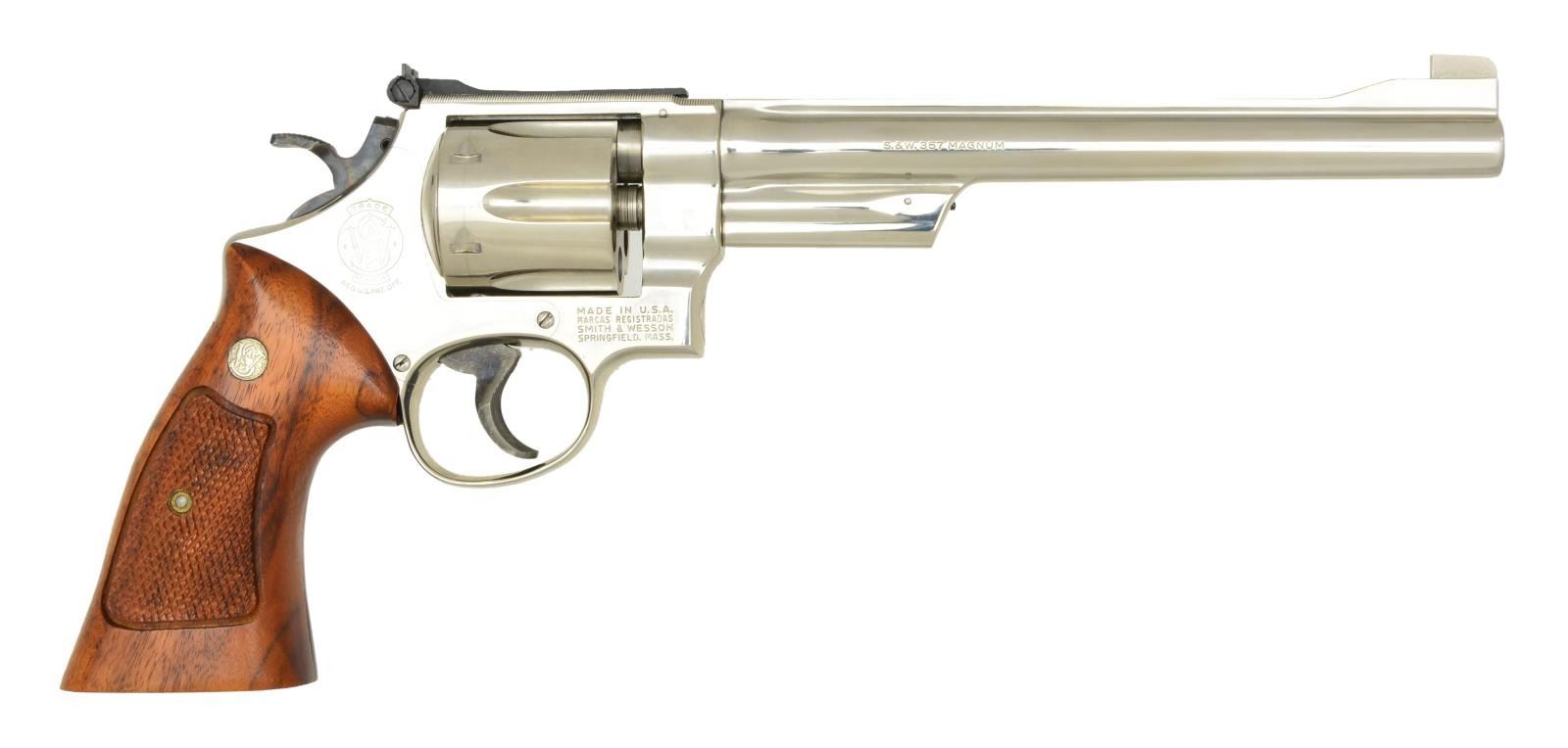 Cal. 357 Mag. S# N651892. Bbl. 8 3/8" pinned w/ Patridge front sight plus Micrometer rear. Mfg. 1979-1980 w/ recessed cyl. & checkered Goncalo Alves target grips having thumb recess. Case colored target trigger & hammer. UNATTACHED ACCESSORIES: good plain repro. box having broken corner on base. Paperwork & S&W cleaning rod w/ brush. CONDITION: extremely faint beginning turn line from functioning; all other aspects near excellent; appearing unfired except for appropriate factory 3 rds. leaving faint cyl. face residue. (21-4219/NW). MODERN. $900-1,400.