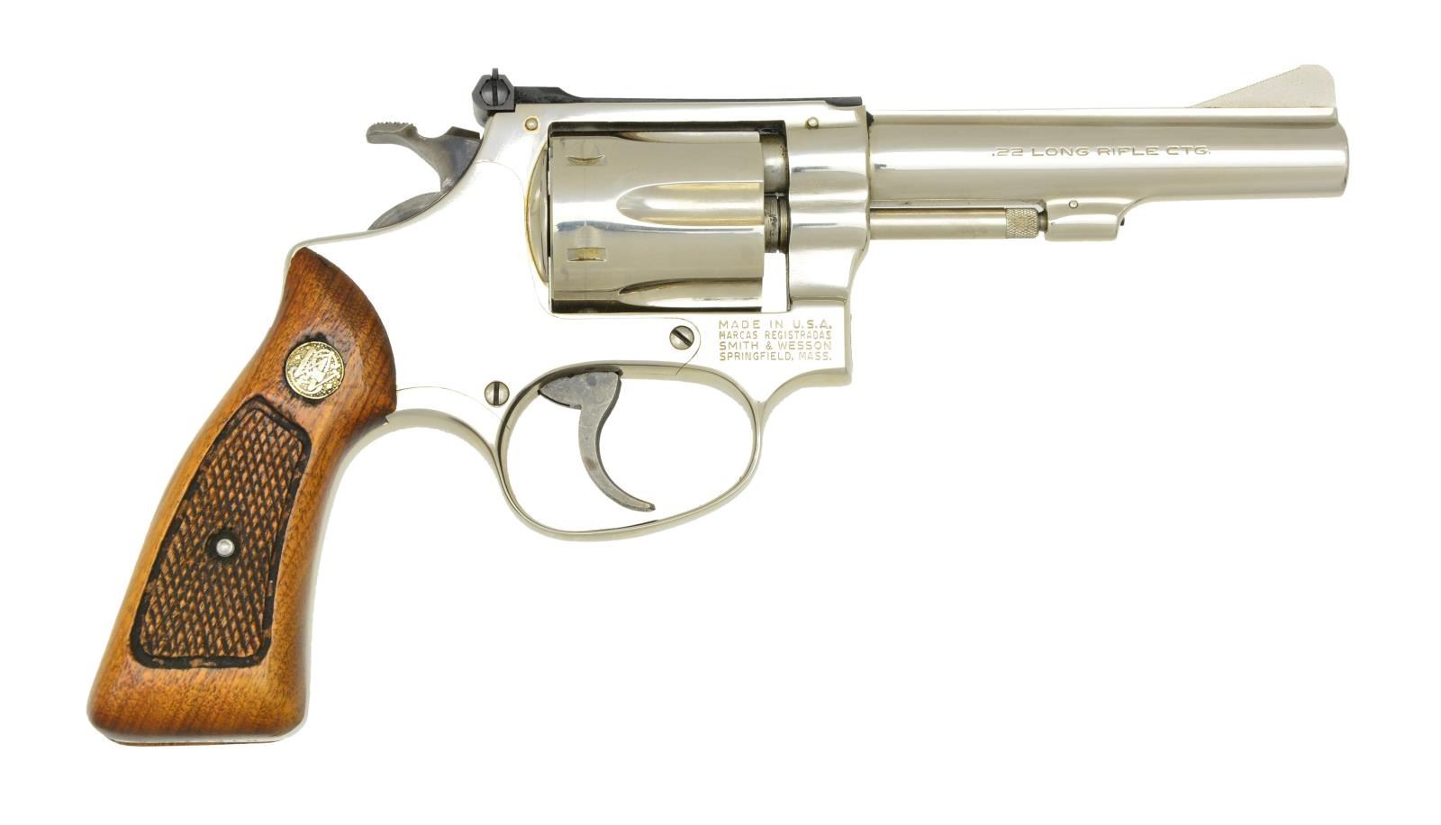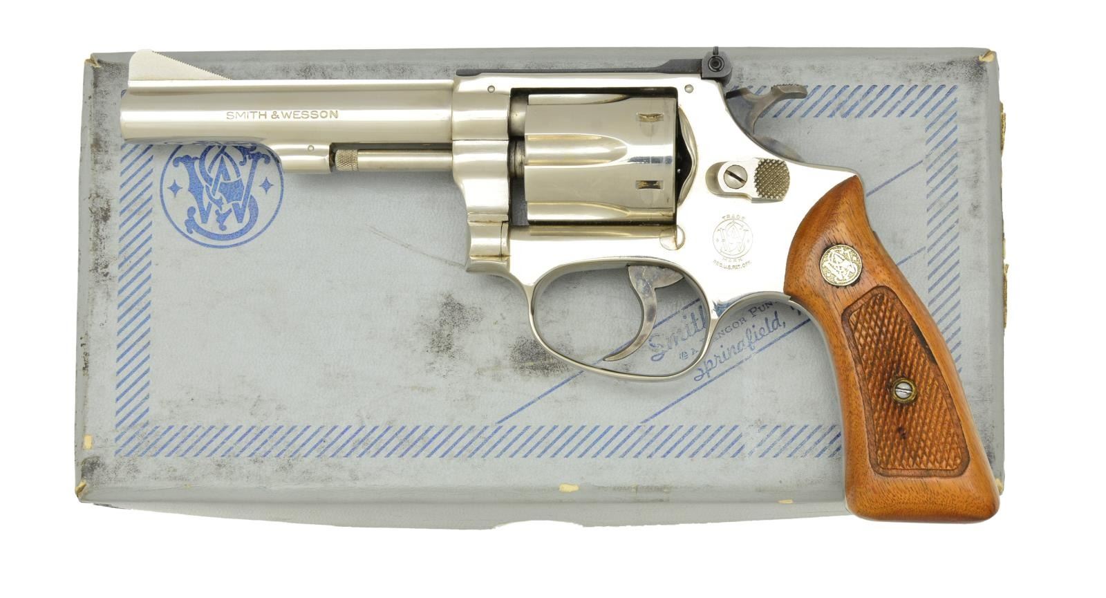 Cal. 22 LR. S# M165429. Bbl. 4" pinned w/ Baughman front sight; blued Micrometer adj. rear. Mfg. 1981 (1953-1991) w/ unnumbered checkered walnut Magna grips. Standard case colored, grooved trigger & checkered hammer. 6 Rd. fluted cyl. & square butt J frame. Scarce nickel plated Kit Gun. UNATTACHED ACCESSORIES: good to very good correct style silver for nickel box w/ label for Model 51; packaging to include complete tool kit. CONDITION: barely visible cyl. turn line plus firing residue on face of cyl.; all other aspects including grips & bore are near excellent. (21-4208/NW). MODERN. $750-1,000.