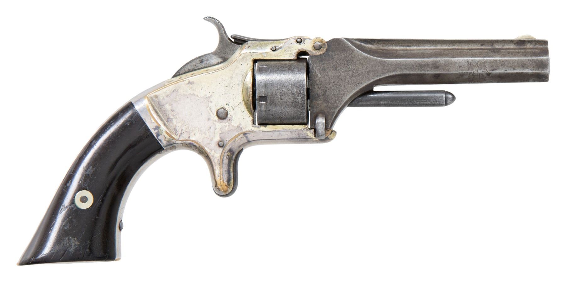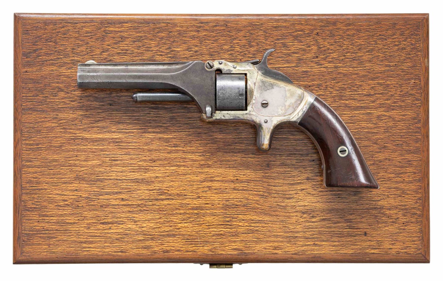 Cal. 22 S. S# 66504. Bbl. 3". Blade front sight. Right grip panel matches frame serial. Bbl. has "9R" assembly number that matches inside of grip frame. 2nd issue No. 1 revolver. Silver plated frame & grip assembly. Case colored hammer & trigger. Smooth hardwood grips. UNATTACHED ACCESSORIES: later hardwood display case with green velvet lining. CONDITION: grips show overall flaking varnish, some dings & handling marks. Bbl., cyl. & ejector rod are mostly a dull gray patina with scattered oxidation, dings & some light pitting. Frame & grip assembly retain strong amounts of their silver plating with overall flaking, some oxidation & dings. Action appears functional when hand cycled. Bore shows scattered pitting with visible rifling. (01-27887/MJC). ANTIQUE. $800-1200.