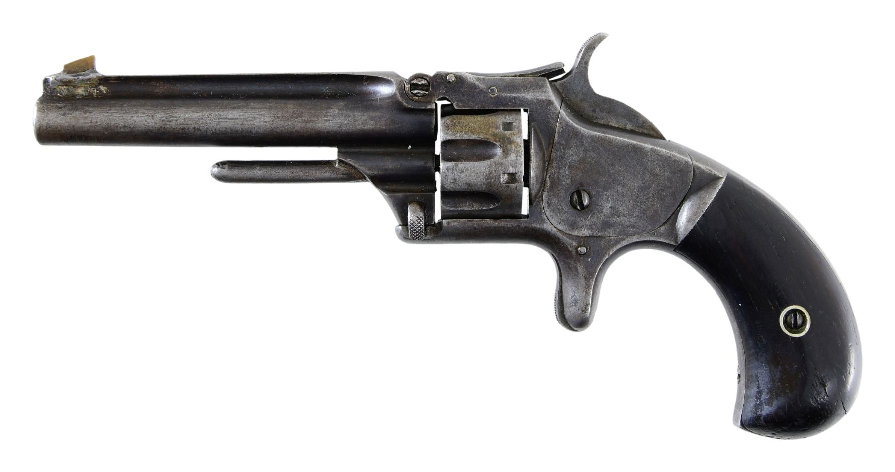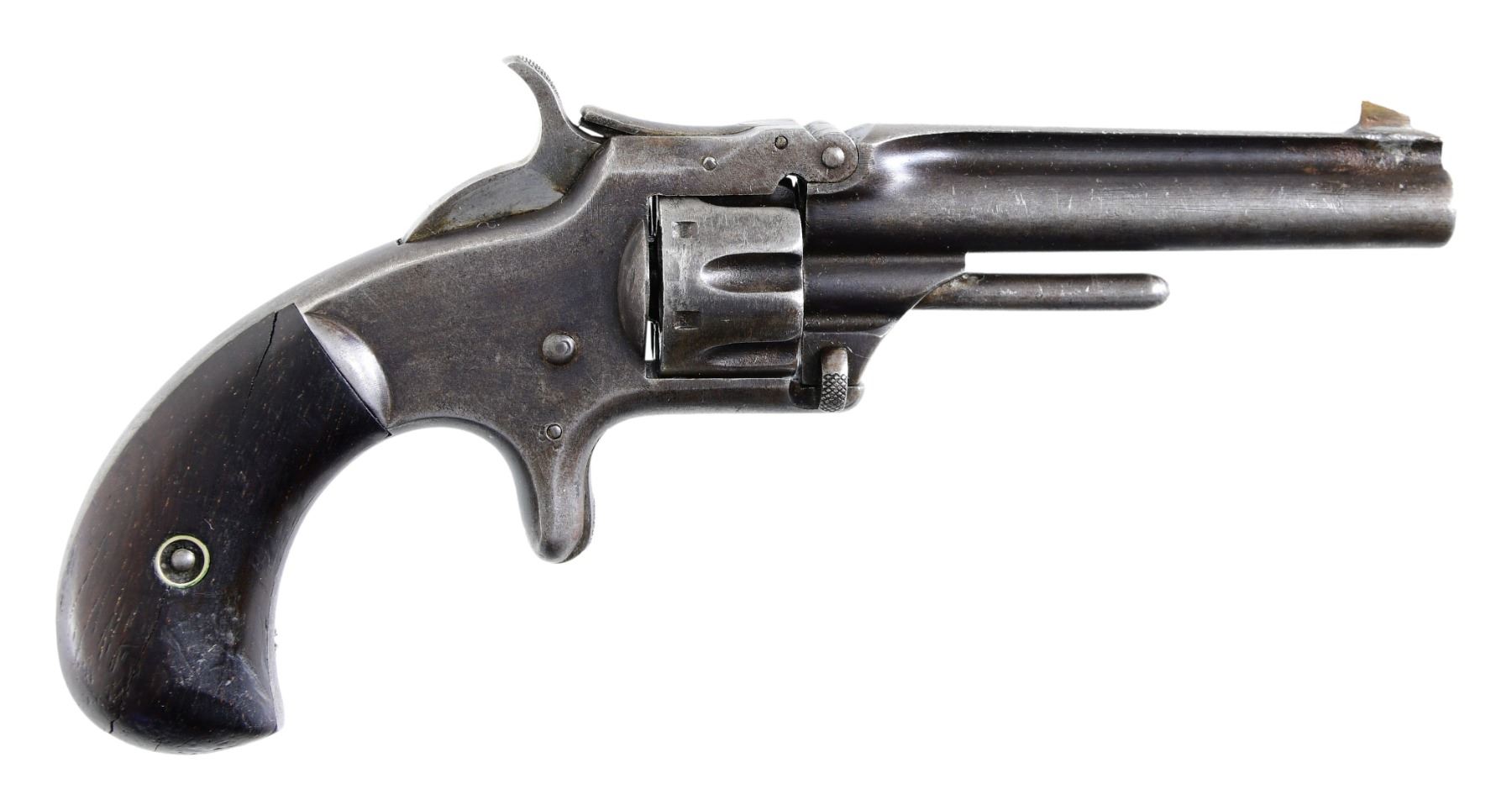 Cal. 22 RF. S# 6268. Bbl. 3 3/16". Replacement brass blade front sight. 3rd issue S&W No. 1 revolver. Smooth hardwood grips. CONDITION: right grip panel shows a long crack along its length, grips otherwise show a few other cracks, flaking dark finish, dings & handling marks. Metal has a gray appearance with a brazed repair on rib below front sight, scattered light dings & oxidation. Hammer does not rotate cyl. when hand cycled & cyl. appears loose. Pitted bore with visible rifling. (01-26571/MJC). ANTIQUE. $200-400.