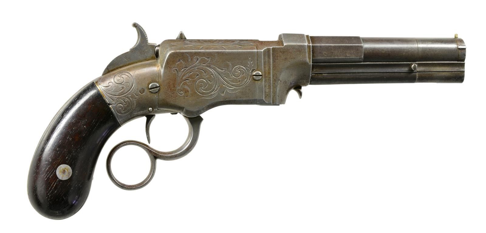 Cal. 31 (conical bullet containing powder & primer). S# 84. Bbl. 4 1/8" rnd. w/ oct. shank having a rounded muzzle. Fine German silver blade front sight w/ fixed V notch rear sight. Top flat is stamped "SMITH & WESSON / NORWICH, CT. / PATENT" w/ "CAST STEEL" marking over "FEBUARY 14, 1854" date. Full length integral front loading mag. Iron action, hammer & back strap have vine type scroll hand engraving. 2 Piece rosewood bag type grips. Based on an 1854 patent issued to Horace Smith & Daniel B Wesson. Estimated 1,700 mfg. 1854-1855. CONDITION: bbl. & mag. tube retain some light & some blue in protected areas w/ balance fading to gray. Action & ring type lever have mottled gray appearance showing spots of very light corrosion. Grips have a age darkened appearance showing light wear. Sound mechanics. Bore retains sound rifling showing sm. spots of very light pitting. (01-18092/DS). ANTIQUE. $7,500-12,000.