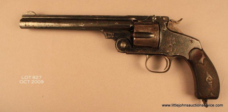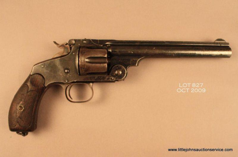 SMITH & WESSON New Model #3, #25643 with #322 on butt strap; .44 cal, 7" barrel, blued finish, lanyard loop, checkered wood grips. Scarce Japanese markings, artillery configuration, retaining approximately 60% plus original blue,with losses at the high points, the sides of the barrel and cylinder from holster wear. Bore is bright and in very good condition, grips are fair with no chips or cracks, but well worn. A rare variation of the Japanese contract big frameSingle Actions. Est. $1,500-$3,000.