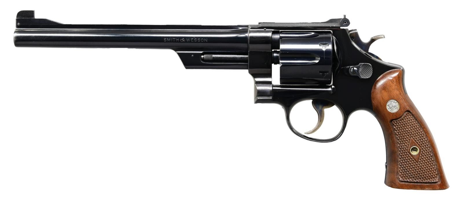 Cal. 357 Mag. S# S162704. Bbl. 8 3/8" pinned. Patridge front sight. Adjustable square notch rear sight. Five-screw pre-27 mfg. 1957-58. Matching numbers on grip frame, bbl., cyl. extractor & right grip panel. Blued finish w/ case colored trigger & target hammer. Checkered walnut grips w/ silver S&W medallions. UNATTACHED ACCESSORIES: aftermarket softcase. CONDITION: grips show a few scattered handling marks. Hammer retains strong traces of case colors but shows overall fading to gray. Trigger retains much more of its case colors w/ some operational wear & lighter fading. Balance of metal retains 95% blue w/ some scattered edge, operational & handling wear. Action is functional when hand cycled. Bright very good plus bore. (24-2117/MJC). CURIO. $1200-1700.
