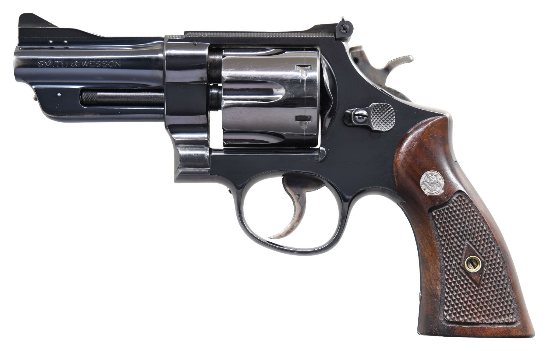 Cal. 357 Mag. S# S77099. Bbl. 3 1/2" pinned. Ramped serrated blade front sight. Adjustable square notch rear sight. Matching numbers on grip frame, bbl., cyl. & extractor. Five-screw Pre-27 made in 1950 with desirable 3 1/2" bbl. Blued finish with case colored hammer & trigger. Checkered diamond center walnut grips with silver S&W medallions. Left grip panel is numbered "76063". UNATTACHED ACCESSORIES: factory letter that confirms the gun's configuration & states it was shipped to Stoeger Arms in NYC in November, 1950. CONDITION: grips show some scratches, dings & handling marks. Hammer & trigger retain most of their case colors with some light operational wear & light oxidation. Balance of metal retains 85% factory reblue with scattered edge wear, some light freckling on cyl. & some scattered light scratches mostly on right side of frame. Action functions properly when hand cycled. Bright near excellent bore. PROVENANCE: From the Estate of Jon Thomas, Gunsport, LTD. (25-1112/MJC). CURIO. $1000-1500.