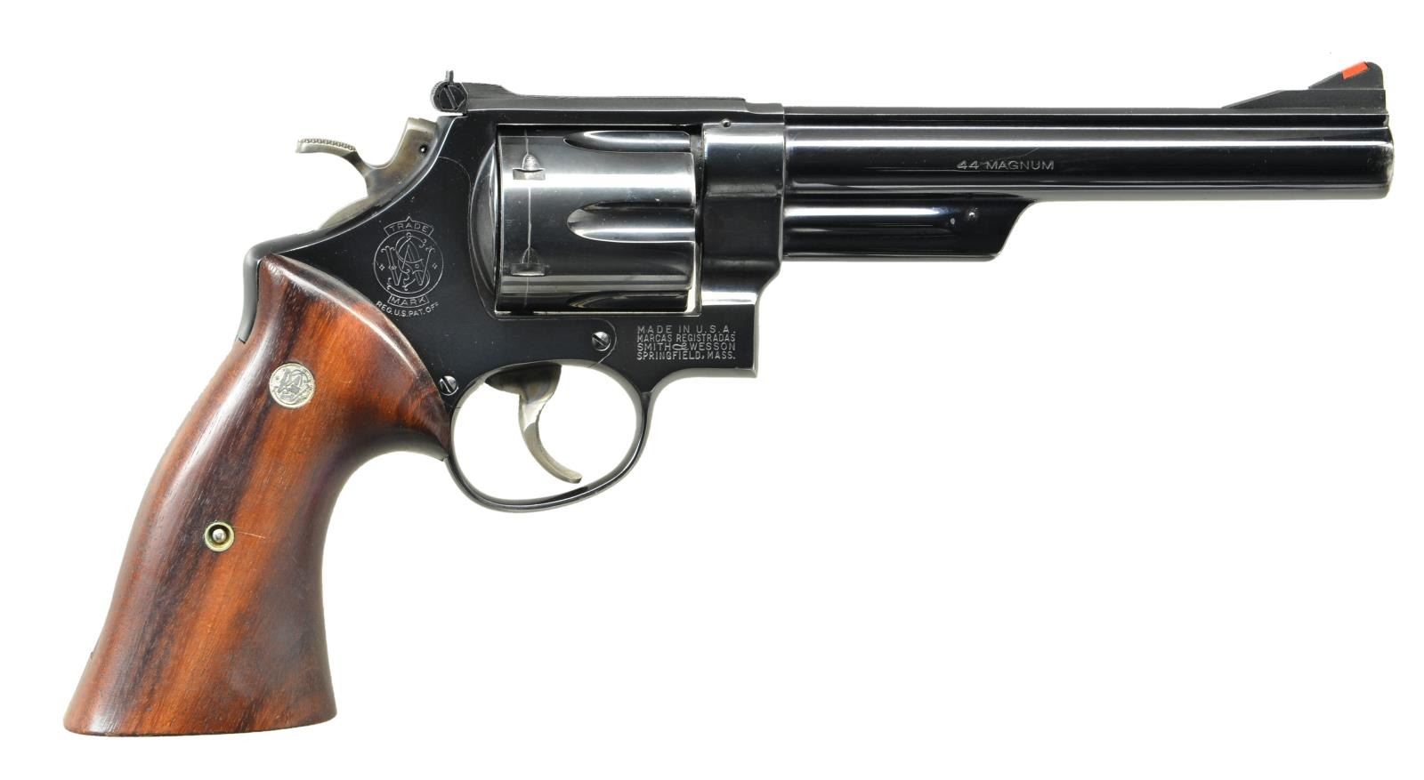 Cal. 44 Mag. S# S175979. Bbl. 6 1/2" w/ rib. Serrated red ramp front sight. Adj. rear sight. 6 shot fluted cyl. 4 screw N frame. Blue finish. Case colored hammer & trigger. Smooth target grips w/ silver S& W medallions. CONDITION: left grip panel has a small chip missing at rear, both panels have small cracks at bottom rear & scattered light scratches. Metal retains 95% quality refinish w/ drag line on cyl. & some high edge wear. Very good plus bore. (22-3123/MJC). CURIO. $500-900.