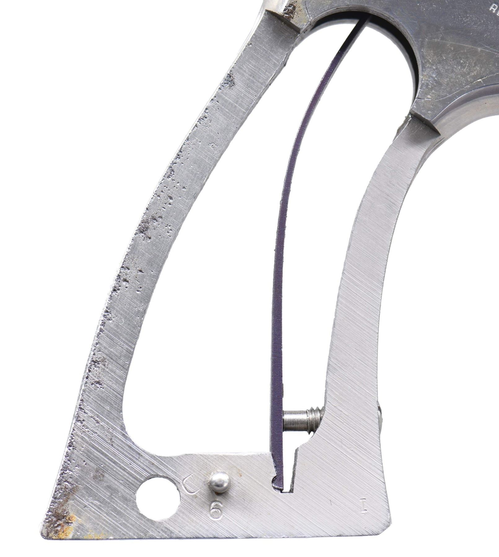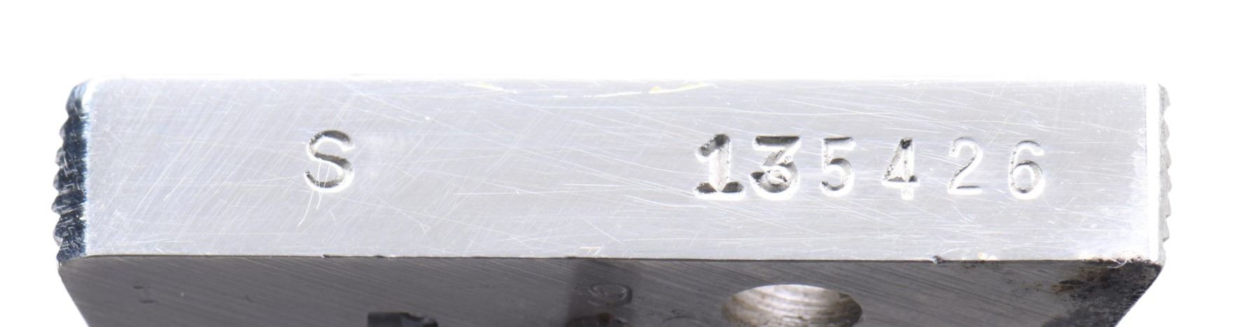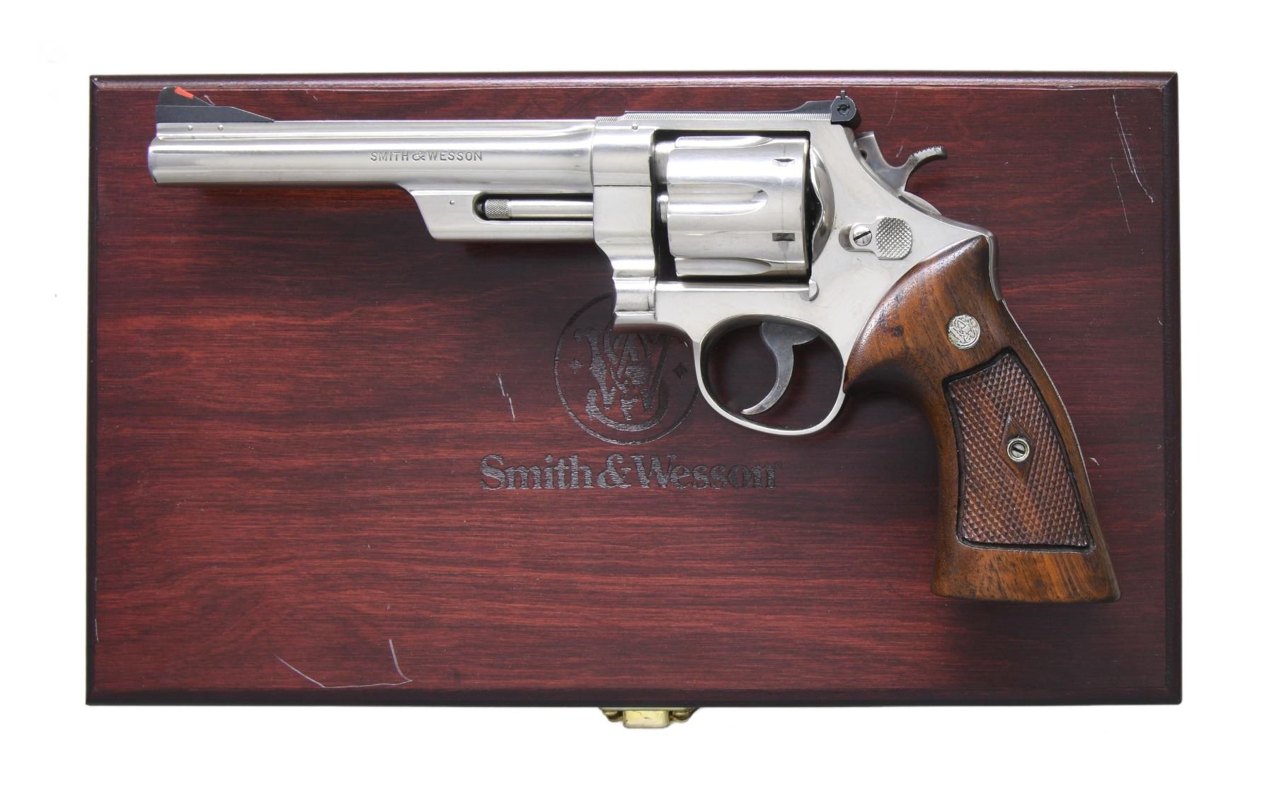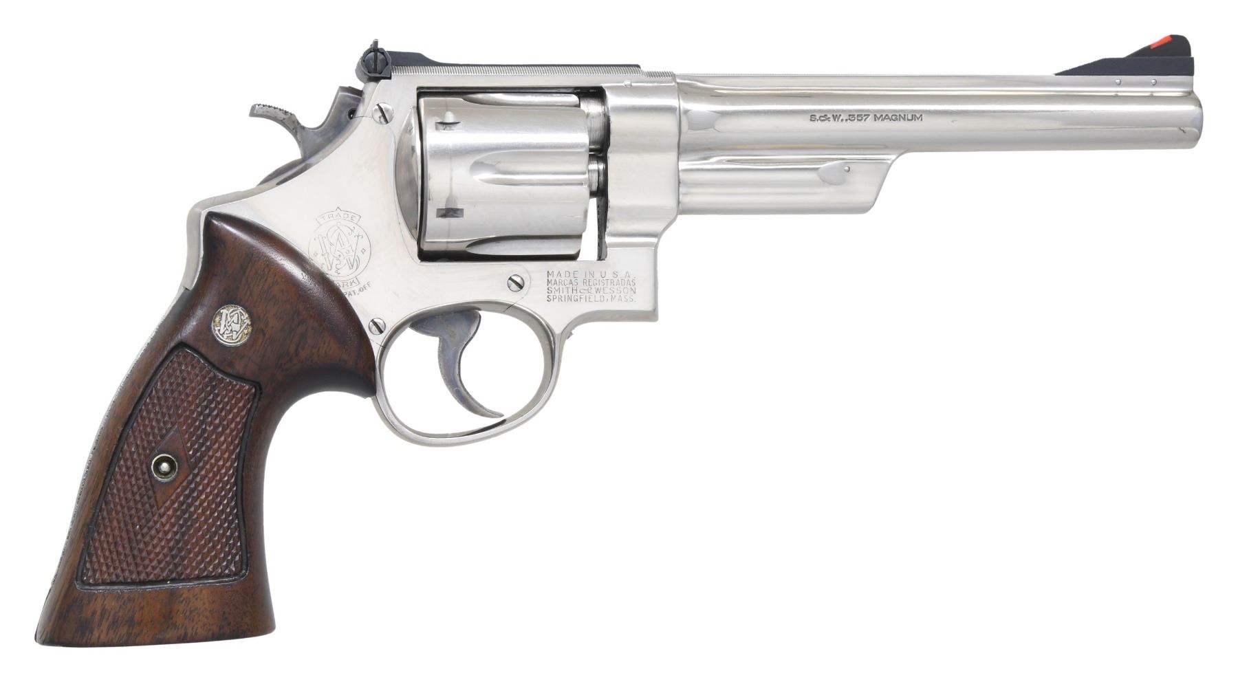 Cal. 357 Mag. S# S135426. Bbl. 6 1/2" pinned. Ramped serrated blade front sight with orange insert. Adjustable square notch rear sight with white outline. Matching numbers on grip frame, bbl. & cyl. Extractor appears unnumbered. Five-screw Pre-Model 27 made 1954-1955. Nickel finish with case colored hammer & trigger. Checkered diamond center walnut target grips with mismatched right panel & silver S&W medallions. Grips are early & lack a thumbrest. UNATTACHED ACCESSORIES: dark hardwood S&W presentation case. CONDITION: refinished grips show a couple dings & scattered handling marks. Trigger & hammer retain most of their case colors with some operational wear & light oxidation. Balance of metal retains most of its original nickel with a drag line on cyl., some fouling on cyl. face, some edge wear & scattered oxidation under grips. Action functions properly when hand cycled. Bright near excellent bore. PROVENANCE: From the Lifelong Collection of George Staden S&W Member #3451. (25-110/MJC). CURIO. $2000-3000.