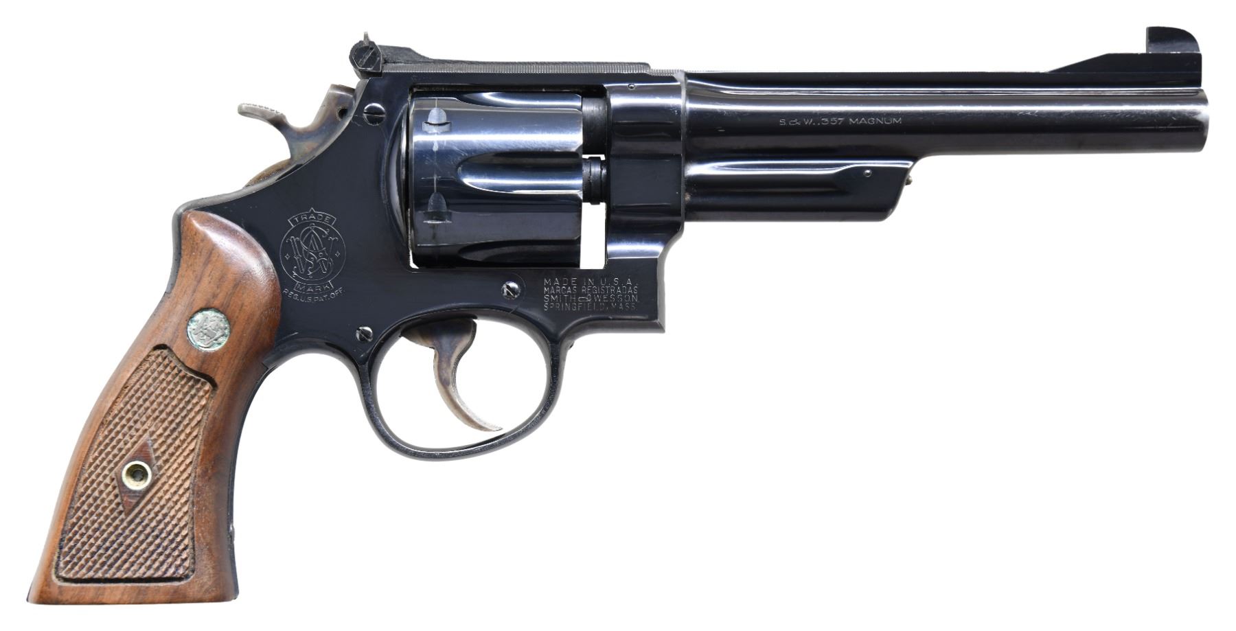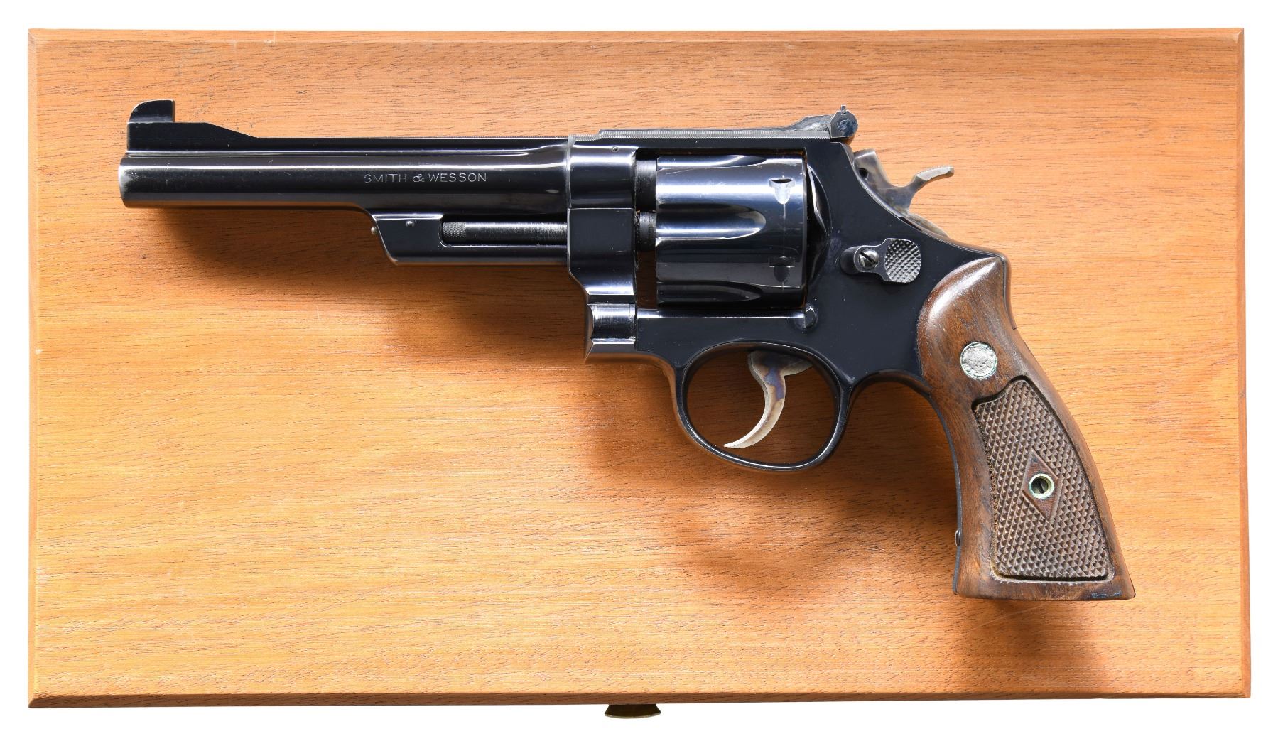 Cal. 357 Mag. S# S84705. Bbl. 6" pinned w/ rib. Patridge front sight w/ micrometer click adj. rear sight. Five screw action has finely checkered top strap w/ six groove grip straps. .265 case colored trigger & .400 case colored hammer. Two piece diamond checkered magna grips w/ S&W medallions. UNATTACHED ACCESSORIES: S&W presentation box. Interior has degraded and is partially removed. CONDITION: over 95% blue showing carry wear & cyl. drag line. Very good grips. Sound action. Very good bore. (24-5643/DS). CURIO. $600-800.