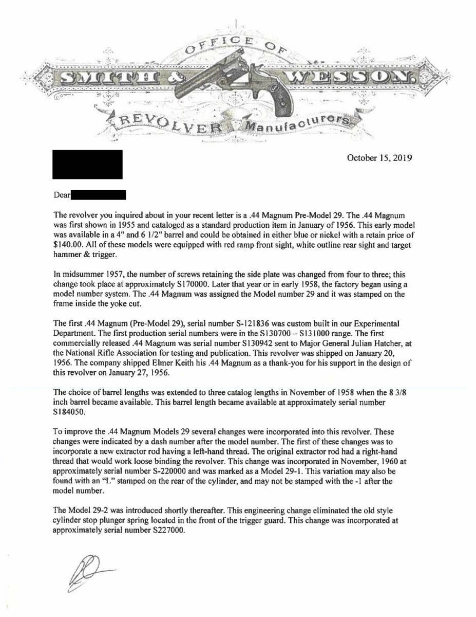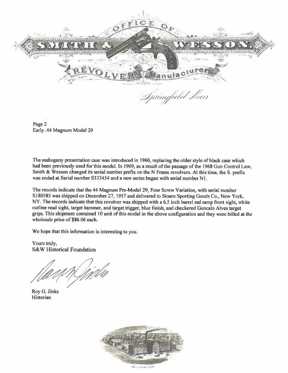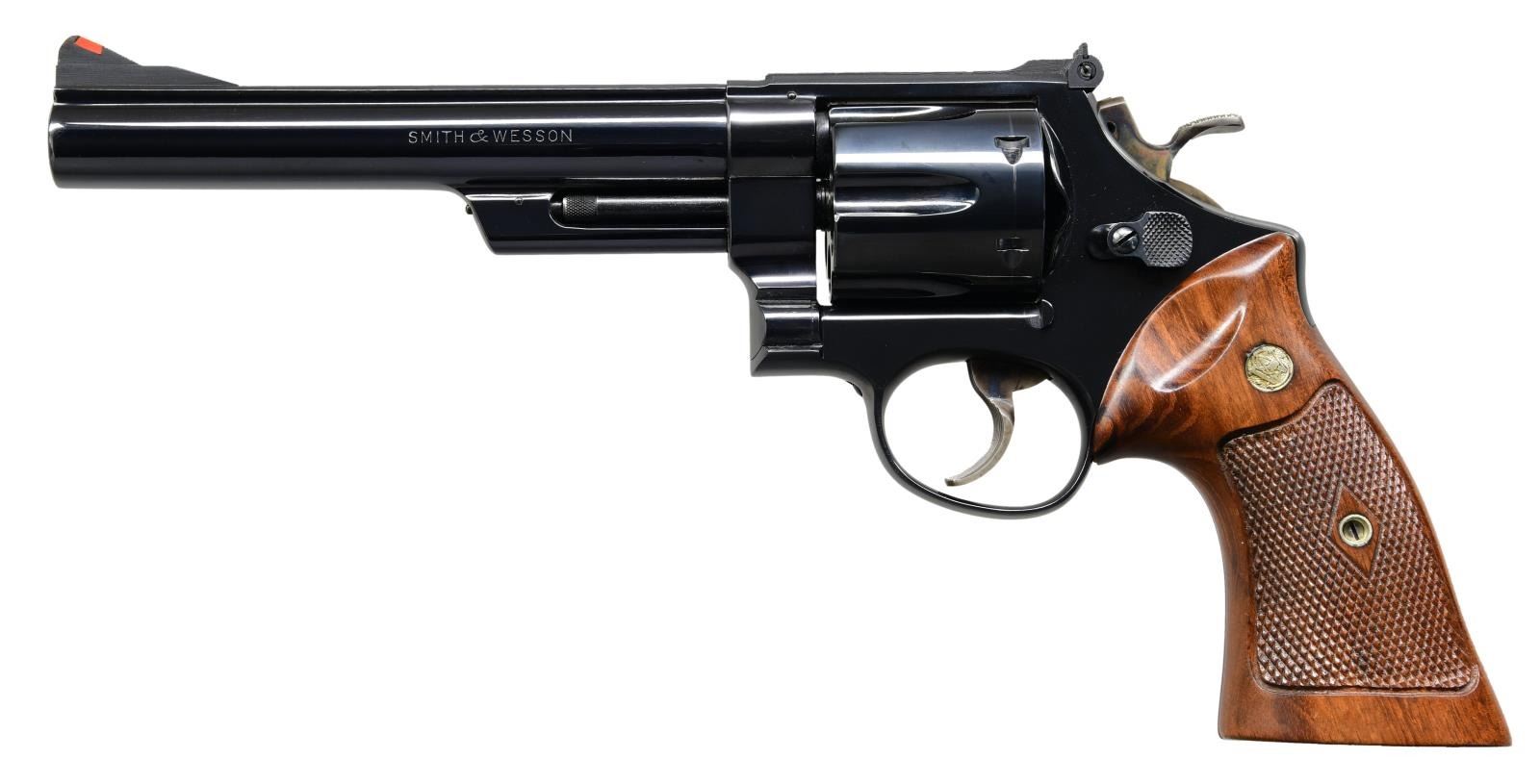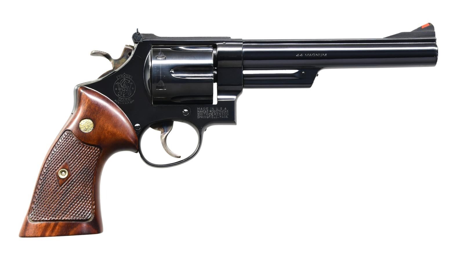 Cal. 44 Mag. S# S180585. Bbl. 6 1/2" pinned. Serrated ramped blade front sight w/ red insert. Adjustable square notch rear sight w/ white outline. Blued finish w/ case colored target trigger & hammer. Unnumbered checkered target grips w/ silver S&W medallions. One grip panel has a darker appearance than the other & they appear mismatched. UNATTACHED ACCESSORIES: aftermarket softcase, factory letter that states that this revolver was part of a 10 gun shipment Sloan's Sporting Goods in NYC on December 27th, 1957. The letter further states the gun was shipped w/ Goncalo Alves target grips & otherwise confirms the guns configuration. CONDITION: refinished grips show an expertly repaired chip on rear of right panel, grips otherwise show light dings near checkering & a few handling marks. Trigger & hammer retain most of their case colors w/ some oxidation specks & light operational wear. Balance of metal retains 98% factory quality restored blue w/ a drag line on cyl. & a couple light handling marks. Action is functional when hand cycled. Bright very good bore. (24-2099/MJC). CURIO. $1400-1900.