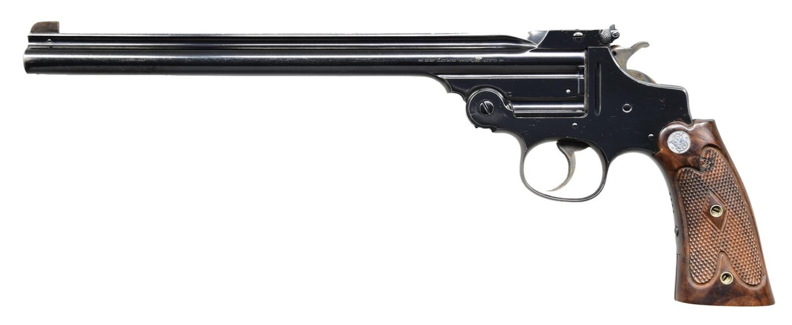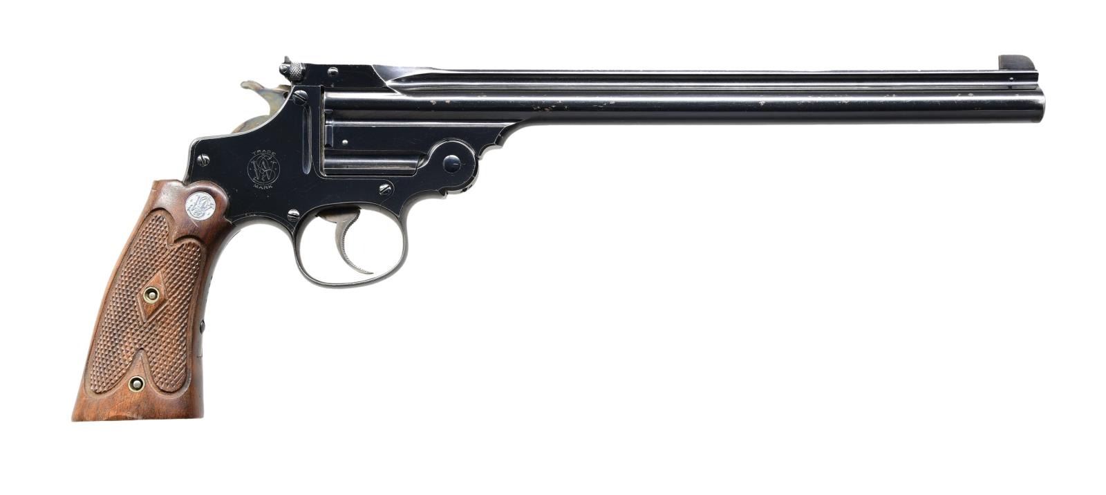 PISTOL. Cal. 22 LR. S# 6456. Bbl. 10". Patridge front sight. Square notch rear sight. Matching numbers on top strap & grip frame. Mfg. 1909-23. Blued finish w/ case colored trigger w/ checkered face & hammer. Unnumbered 2-piece checkered walnut grips w/ silver S&W medallions. CONDITION: left grip panel has a 1/2" crack below medallion. Grips otherwise show a few light dings & some handling marks. Trigger & hammer retain nearly all of their case colors w/ some light operational wear. Balance of metal retains 90% original blue w/ scattered edge wear & flaking to brown. Bright near excellent bore. (24-2132/MJC). CURIO. $1,200-1,500.
