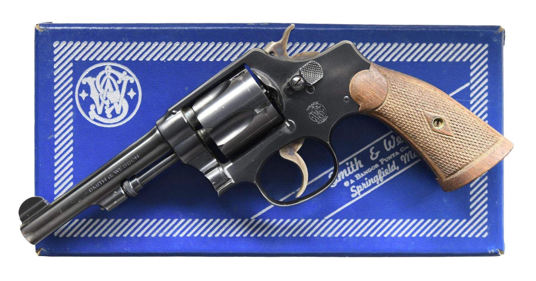 REVOLVER WITH FACTORY BOX. Cal. 32 S&W. S# 29186. Bbl. 4". Regulation Police double action revolver, mfg. by Smith & Wesson. Left side of the bbl. is marked "SMITH & WESSON", with S&W's mfg. and patent information marked over the top, and "REGULATION POLICE" above the cal. designation on the right. Left side of frame is marked with the S&W trademark logo, with "MADE IN U.S.A." marked on the right. Metal components exhibit a blue finish overall, save for on the trigger and hammer, which exhibit a case color hardened finish. Frame is mounted with 2-piece checkered wood grips, which appear to have been lightly sanded and oiled. Half-moon blade front sight, with frame notched rear sight. Matching numbers are present on the frame, cyl., ejector, and bbl. Matching assembly #s are present on the frame and cyl. crane. UNATTACHED ACCESSORIES: non-matching Model 34-1 factory box. CONDITION: metal components retain the majority of their original factory blue finish, exhibiting some light edge wear and some superficial handling marks, with mild wear and thinning present on either side of the bbl. at the muzzle. Trigger and hammer retain the majority of their vibrant case color-hardened finish. Mirror bore, exhibiting a few scattered spots of light to mild pitting/oxidation towards the muzzle, while retaining well-defined rifling throughout. Grips are excellent, as lightly sanded and oiled, with a few minor superficial handling marks overall. Box is very good overall, with some mild exterior wear as well as some discoloration that is present on the label. (24-5618/MLW). CURIO. $700-1,000.