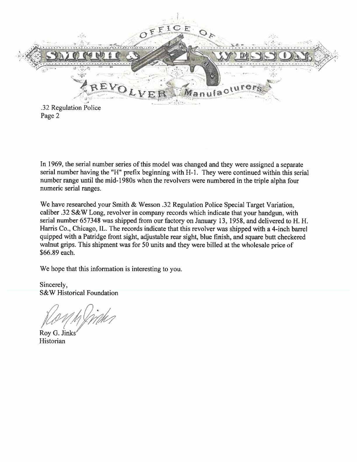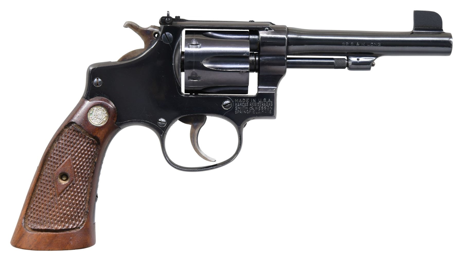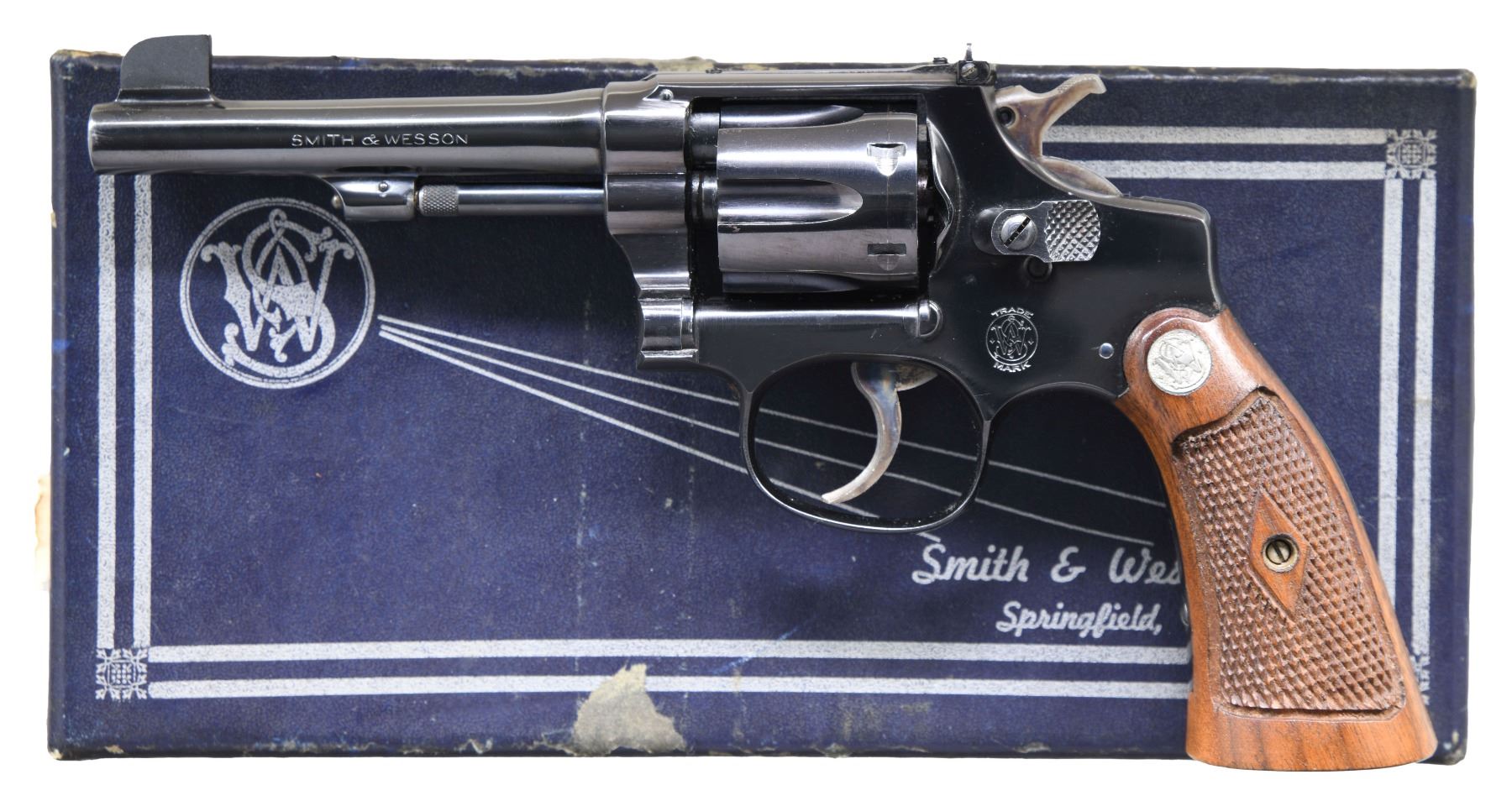 REVOLVER. Cal. 32 S&W. S# 657348. Bbl. 4" pinned. Blade front sight. Adjustable square notch rear sight. Matching numbers on grip frame & right grip panel. Cyl. & extractor are both numbered "657293". Rare post-war target 32 Regulation Police with only 196 units made. Blued finish with case colored hammer & trigger. Checkered walnut diamond center grips with silver S&W medallions. UNATTACHED ACCESSORIES: correct factory box that is numbered matching white grease pencil with manual, screwdriver & cleaning kit. A factory letter is included that confirms the configuration & states it was shipped to H.H. Harris in Chicago in 1958. CONDITION: grips show light handling marks. Trigger & hammer retain most of their case colors with some operational wear. Balance of metal retains 95% factory reblue with a few spots of light oxidation, some operational & edge wear. Action functions properly when hand cycled. Very good bright bore. PROVENANCE: From the Estate of Jon Thomas, Gunsport, LTD. (25-1089/MJC). CURIO. $2500-3500.