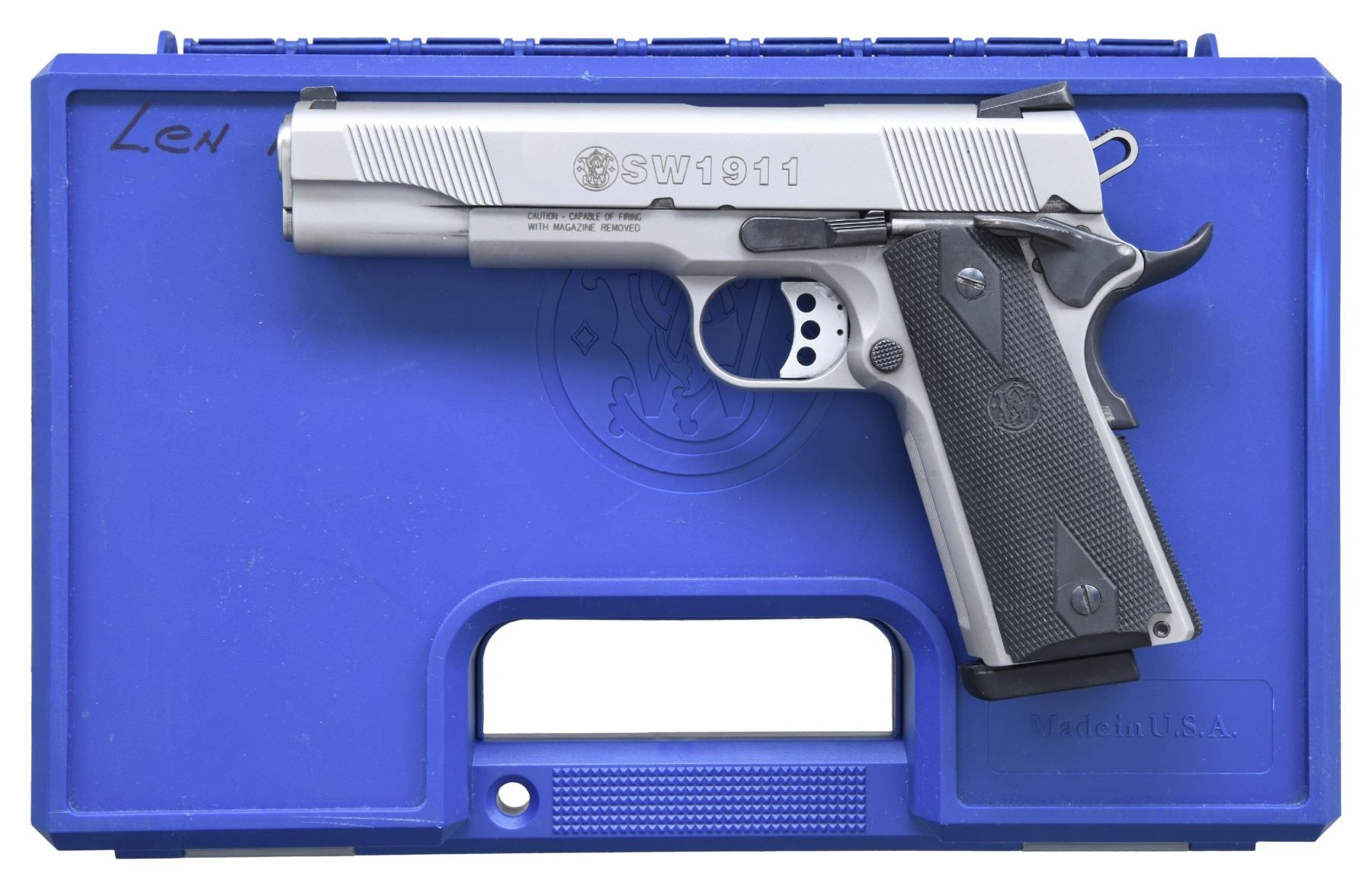 Cal. 45 ACP. S# JRD9389. Bbl. 5". Three dot sights with Novak's rear. Early production S&W 1911 pistol made 2003-2004. Extended beavertail grip safety. Extended right hand safety. Stainless finish with matte black small parts. Checkered black rubber grips with S&W monograms. MAGS: 2-7 rd. UNATTACHED ACCESSORIES: matching numbered factory hardcase with manual & fired case. CONDITION: grips & metal show some light handling & operational wear. Action functions properly when hand cycled. Bright near excellent bore. PROVENANCE: From the Lifelong Collection of George Staden S&W Member #3451. (25-190/MJC). MODERN. $500-800.