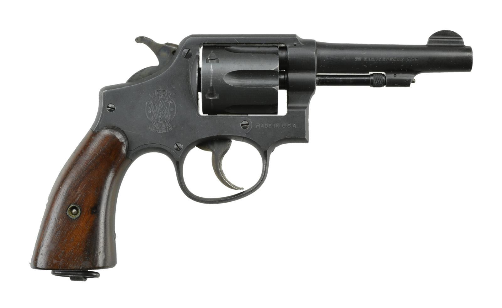 Cal. 38 S&W Special. S# V719604. Bbl. 4". Mfg.1942-1945. Double action revolver built on the square butt K-Frame. Built w/ the "V" prefix, for victory over the axis powers in WWII. 6 shot fluted cylinder. Matte black finish. Round blade front sight w/ square notch rear sight. Smooth hardwood grips. Checkered hammer spur. Checkered cylinder release. Lanyard loop at butt. Top strap marked "U.S. PROPERTY" w/ initials "G.H.D.". Frame marked "P" on left side between hammer & cylinder. Right side of frame marked "MADE IN USA" below cylinder. CONDITION: Correct style matte black finish, originally referred to as "Black Magic Finish" resembling parkerizing. Coverage is quite complete & consistent w/ some scattered thinning. Matching numbers on barrel, frame, cylinder & ejector. Shiny bore w. sharp rifling. (22-4318/JZ). CURIO. $300-500