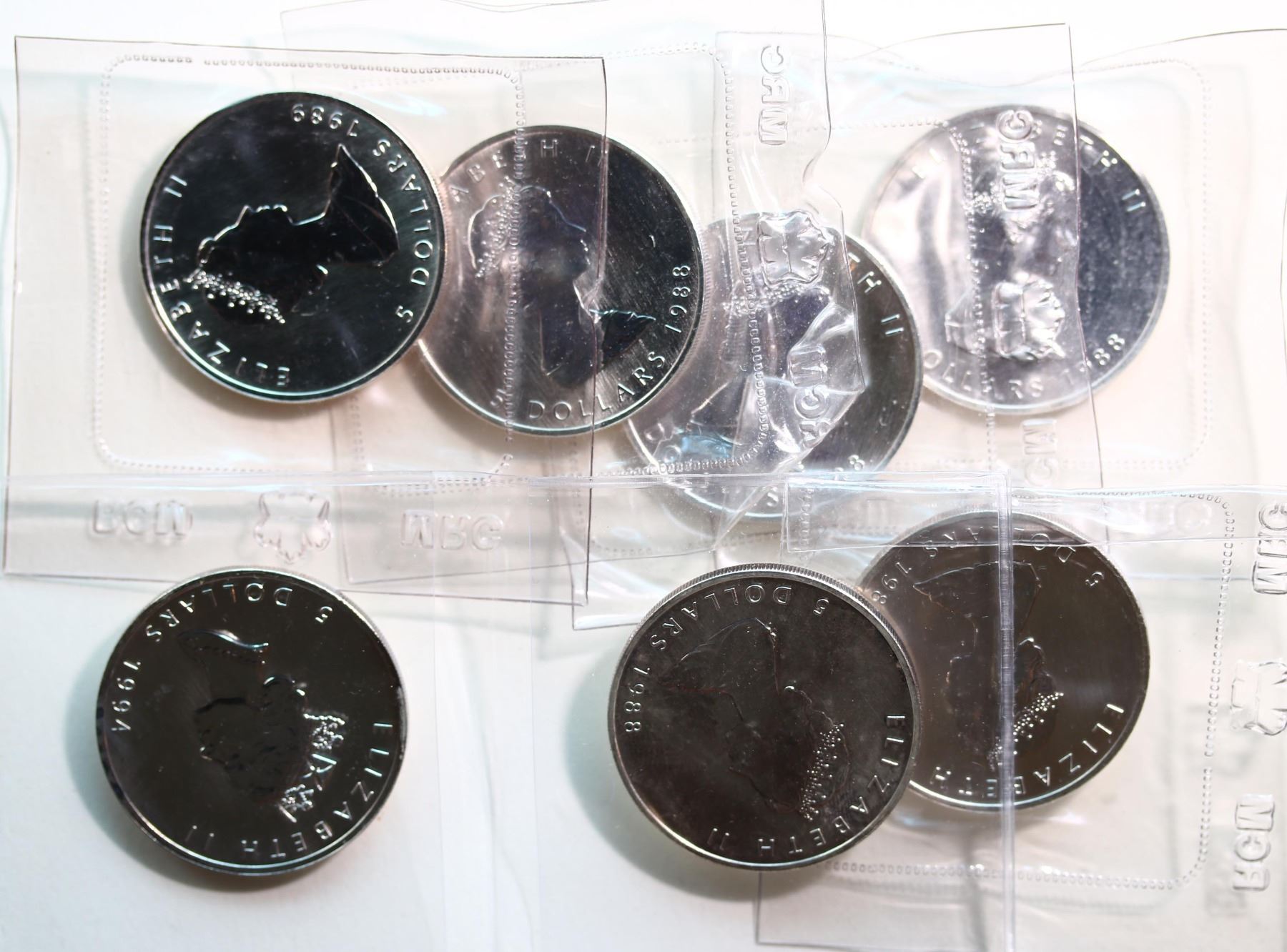 SML; 1996 Silver maple Leaf. Lot of 5 pieces housed in original RCM packaging.