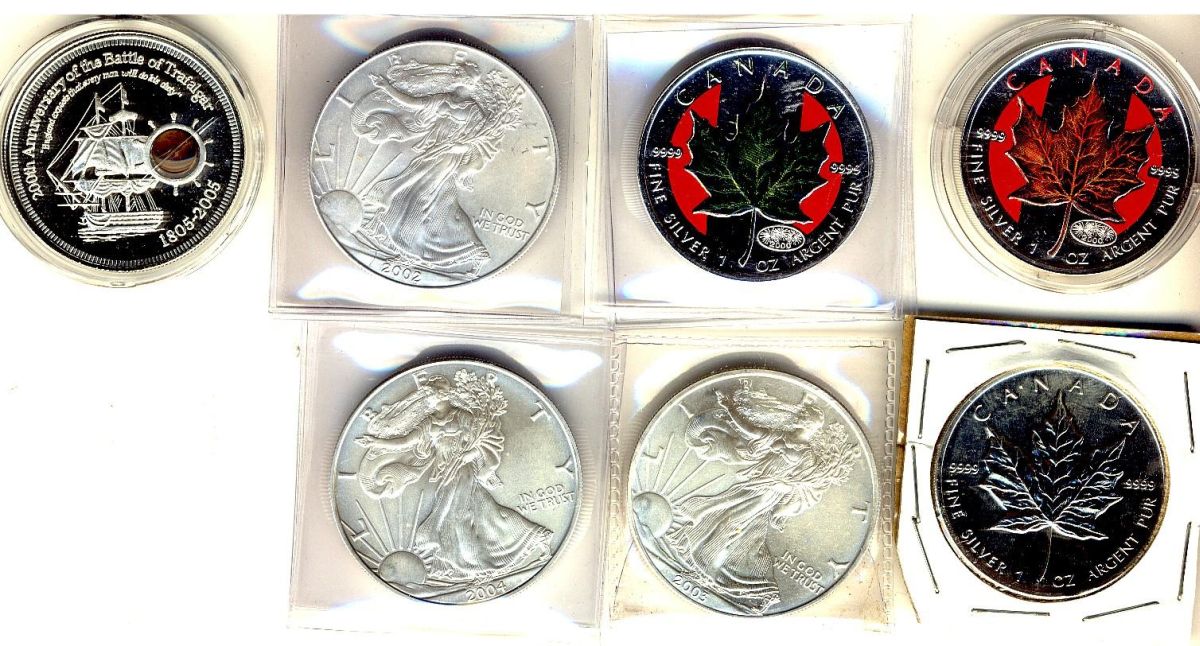 SML, lot of 7 coins including US 2003, 2004 & 2005 issues, Canada 2000 Coloured Maple Leafs Green(1) and Orange Brown(1), 2002 regular and Cook Island 1805-2005 200th Annof the Battle of Trafalgar.