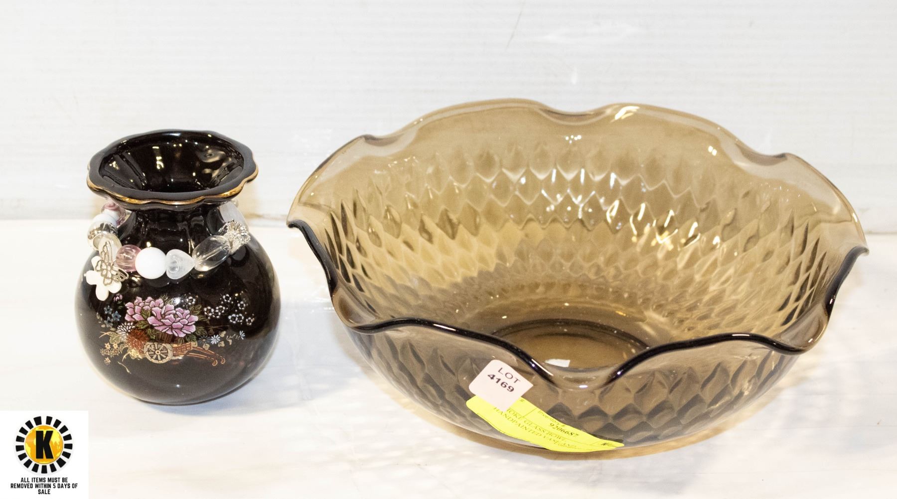 SMOKE GLASS BOWL, HANDPAINTED VASE AND
