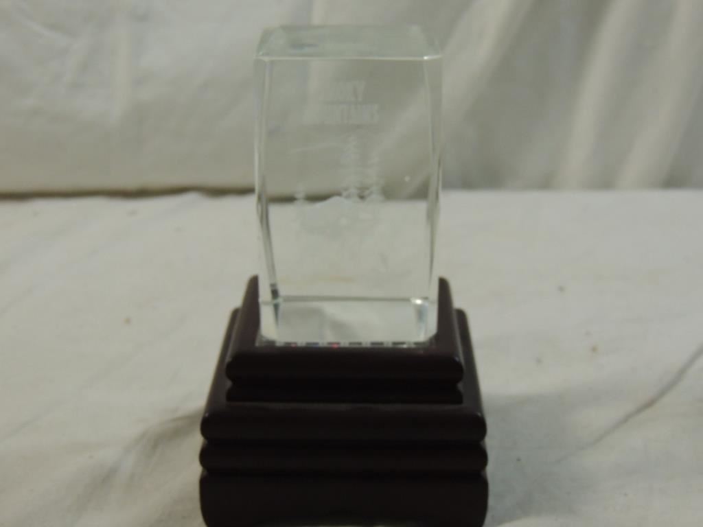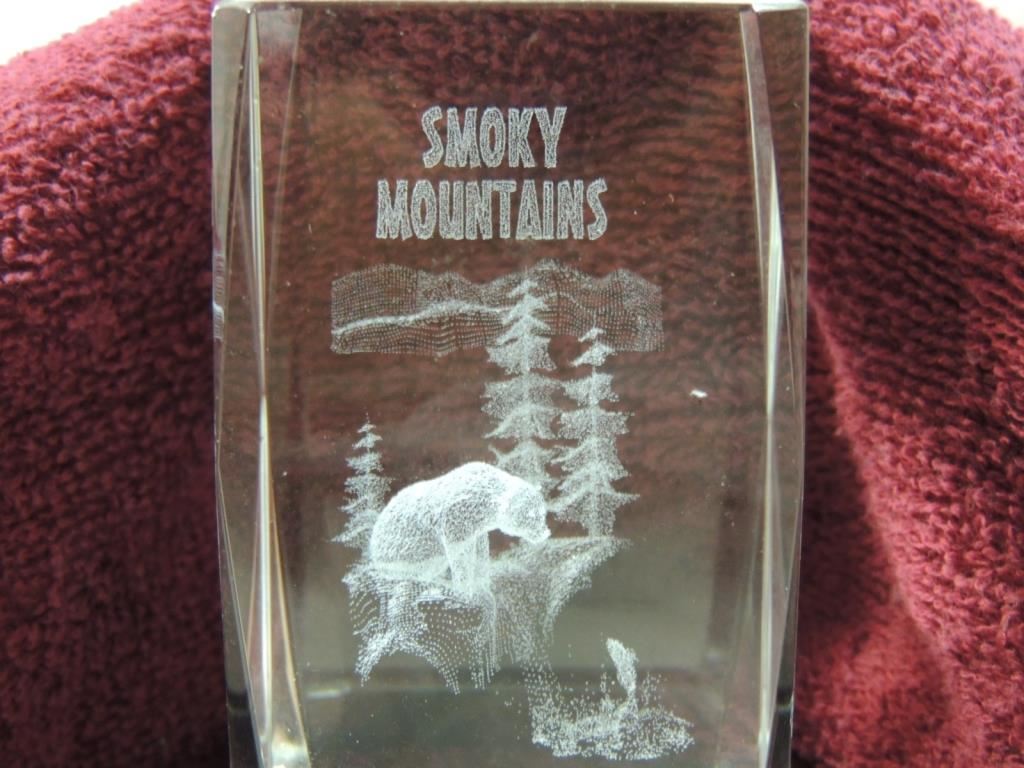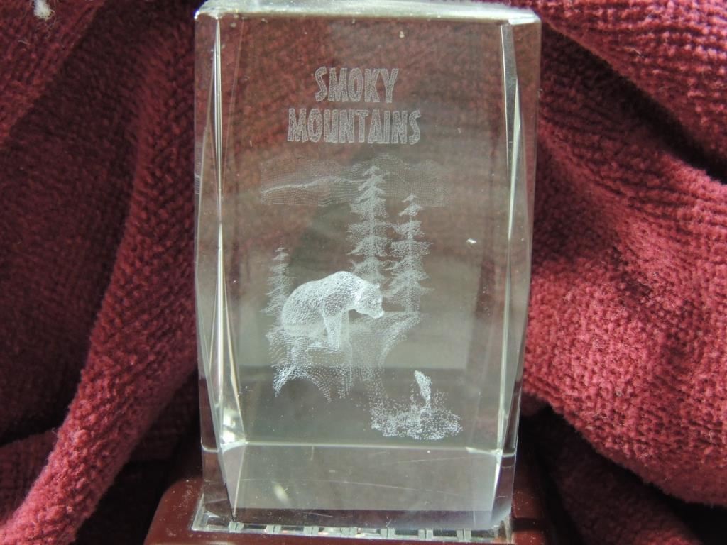 GLASS CUBE LASER ETCHED BEAR IN WILDLIFE SMOKY MOUNTAINS COLLECTIBLE, DECORATIVE AS SHOWN SEE PHOTO FOR MORE DETAILS