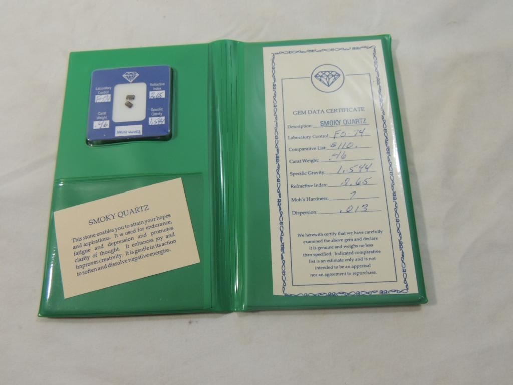 .46 CARAT WEIGHT GEM STONE CERTIFICATE COLLECTIBLE STONES, DATA CERTIFICATE, SMOKY QUARTZ AS SHOWN SEE PHOTO FOR MORE DETAILS.