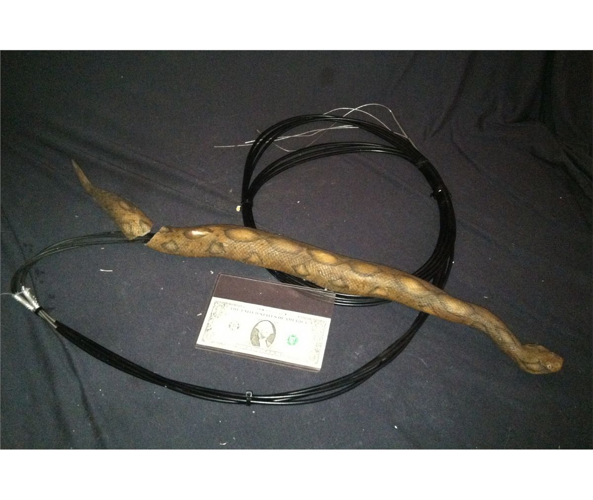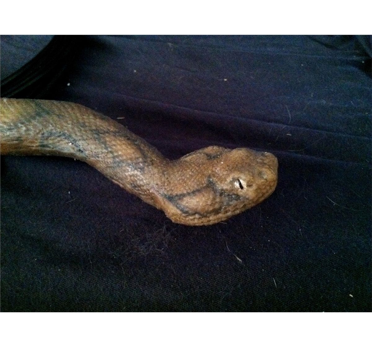 This is a very cool animatronic silicone snake puppet used in Snakes on a Plane. Looks very realistic. The tail is loose where the cables come out, but it could be fixed with silicone glue.
