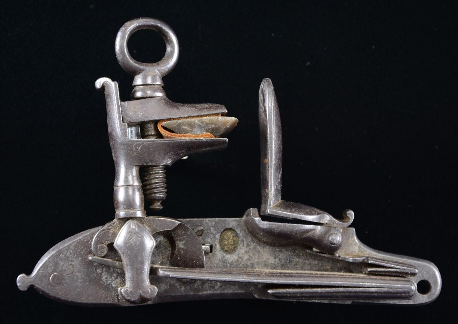 Consignor states lock circa 1670. Lock measures approx. 5 1/4". Brass oval plate in lock reads "RI / GO". CONDITION: metal has patina appearance with light pitting. Lock appears to function to when cycled by hand. (02-21087/MD). $300-400.