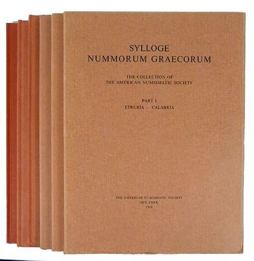 Sylloge Nummorum Graecorum. SYLLOGE NUMMORUM GRAECORUM. THE COLLECTION OF THE AMERICAN NUMISMATIC SOCIETY. PARTS 1-6. New York: ANS, 1969-88. Six volumes. Folio, Parts 1-3 in the original printed russet card covers, Parts 4-6 in the original printed russet boards. 239 fine plates depicting 8179 coins, accompanied by introductory and descriptive text. Fine. All six folio-format ANS SNG volumes, covering: Part 1, Etruria-Calabria; Part 2, Lucania; Part 3, Bruttium-Sicily I: Abacaenum-Eryx; Part 4, Sicily II: Galaria-Styella; Part 5, Sicily III: Syracuse-Siceliotes; Part 6, Palestine-South Arabia. Clain-Stefanelli 1917* (Parts 1-5). Daehn 1303. Kroh 13 (four stars): “This collection is one of the best in the world and both the scope and scholarship of these volumes are excellent.”