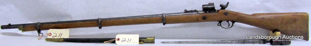 ANTIQUE, SINGLE SHOT, 577 SNIDER, 36 1/2" BARREL, SN NONE. WOOD HAS NUMEROUS SCRATCHES AND DENTS, BLUING IS WORN AND BROWN, BORE PITTED, SOME RIFLING. LOCK DATED 1861. COMES WITH BAYONET AND SHEATH.