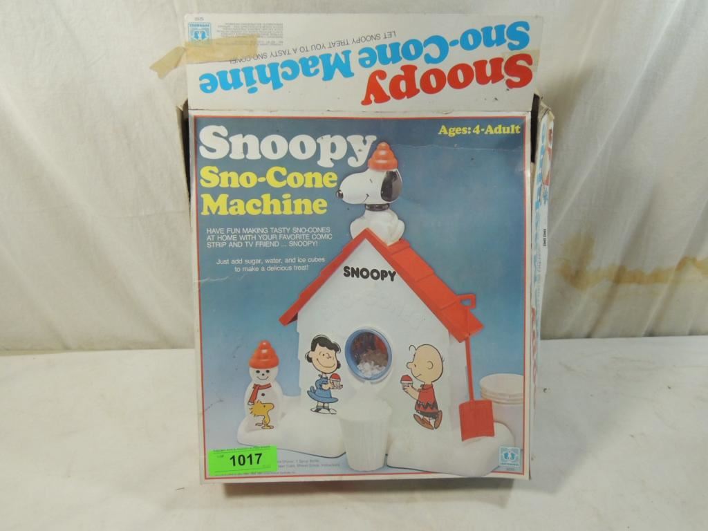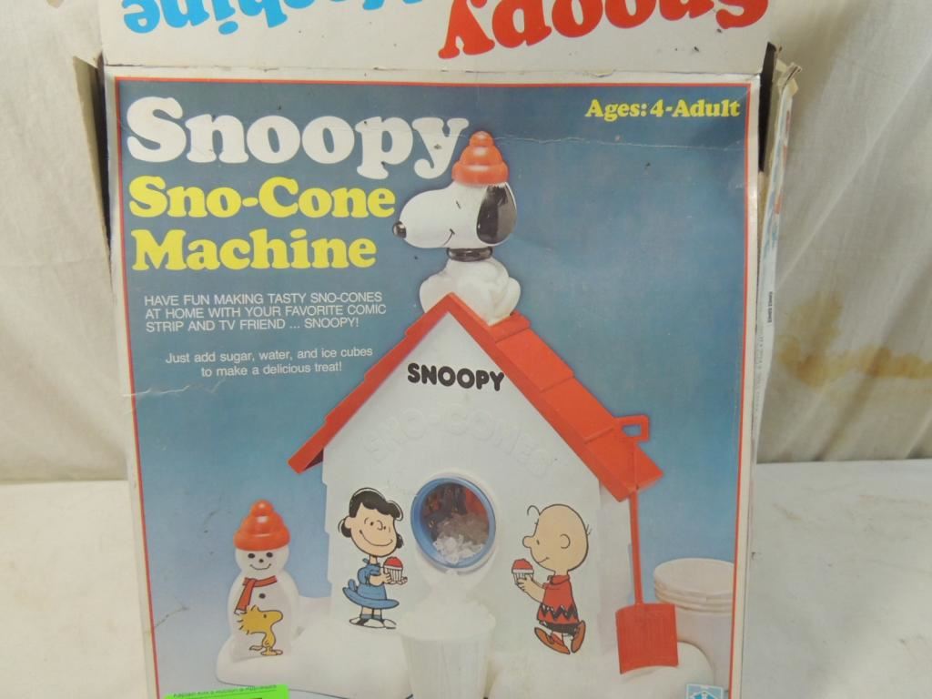 SNOOPY SNOW CONE MACHINE, HAVE FUN MAKING TASTY SNO CONES AT HOME WITH YOUR FAVORITE COMIC STRIP AND TV FRIEND .. SNOOPY. IN ORIGINAL BOX, AS SHOWN SEE PHOTO FOR MORE DETAILS.