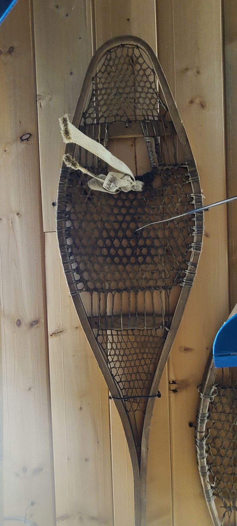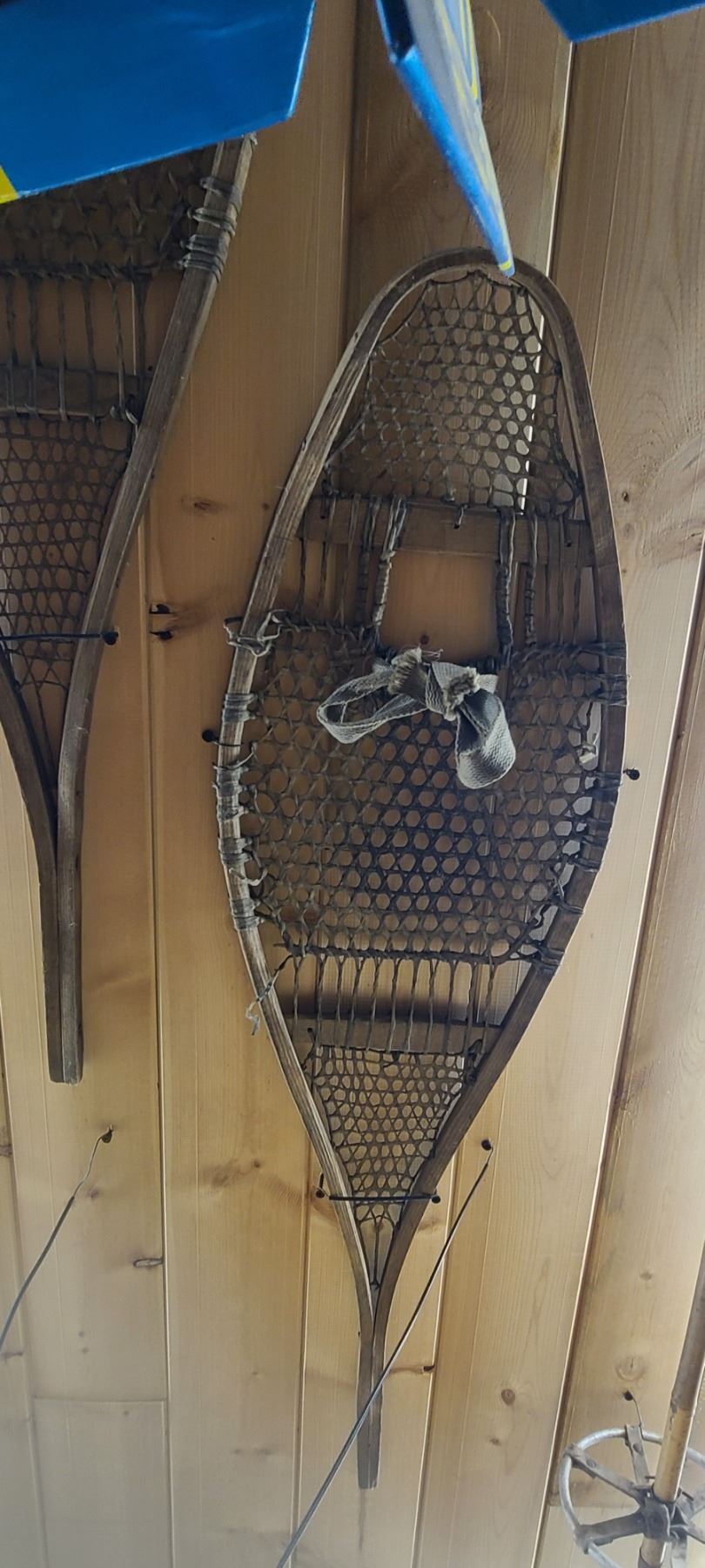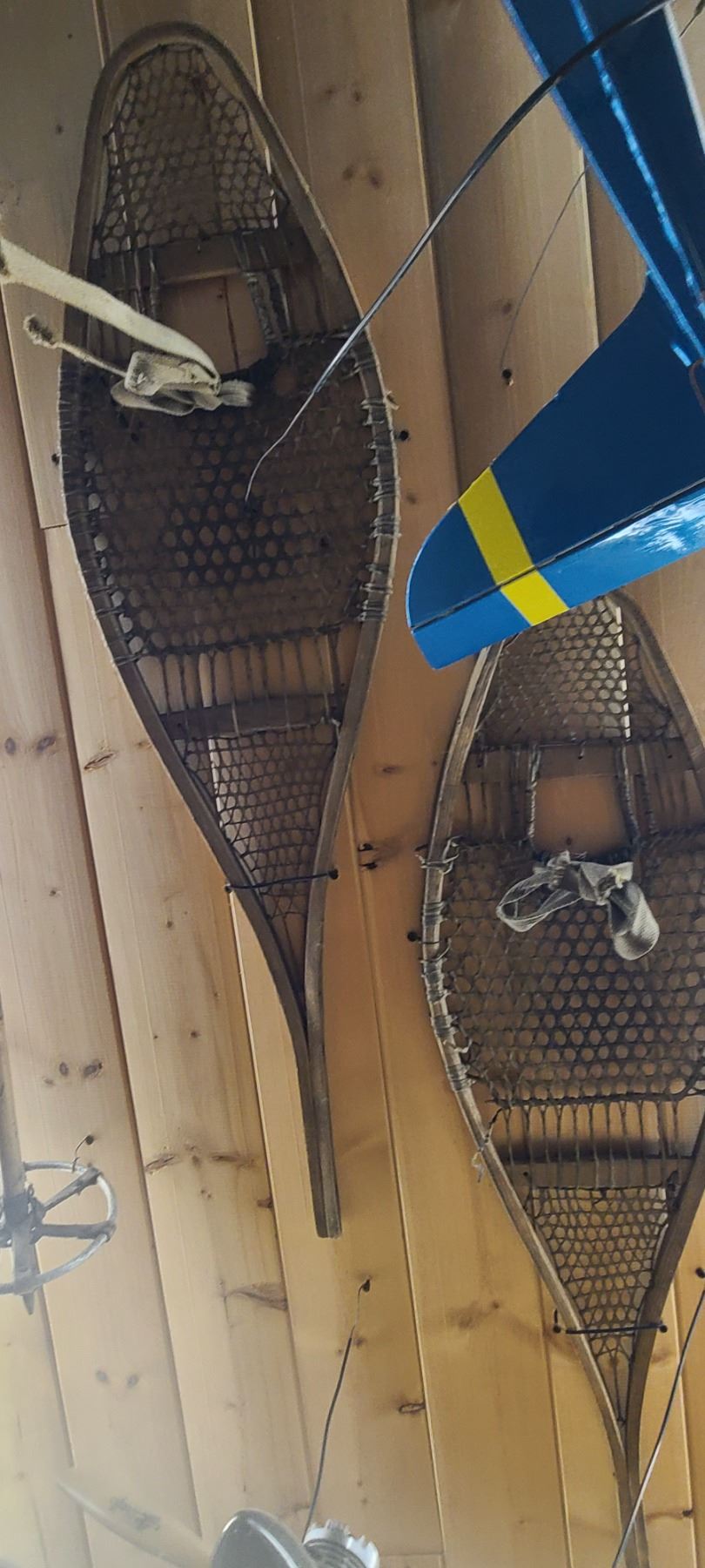 SNOW SHOES AND TWO SETS OF POLES ON CEILING