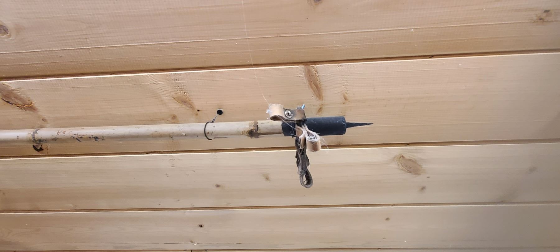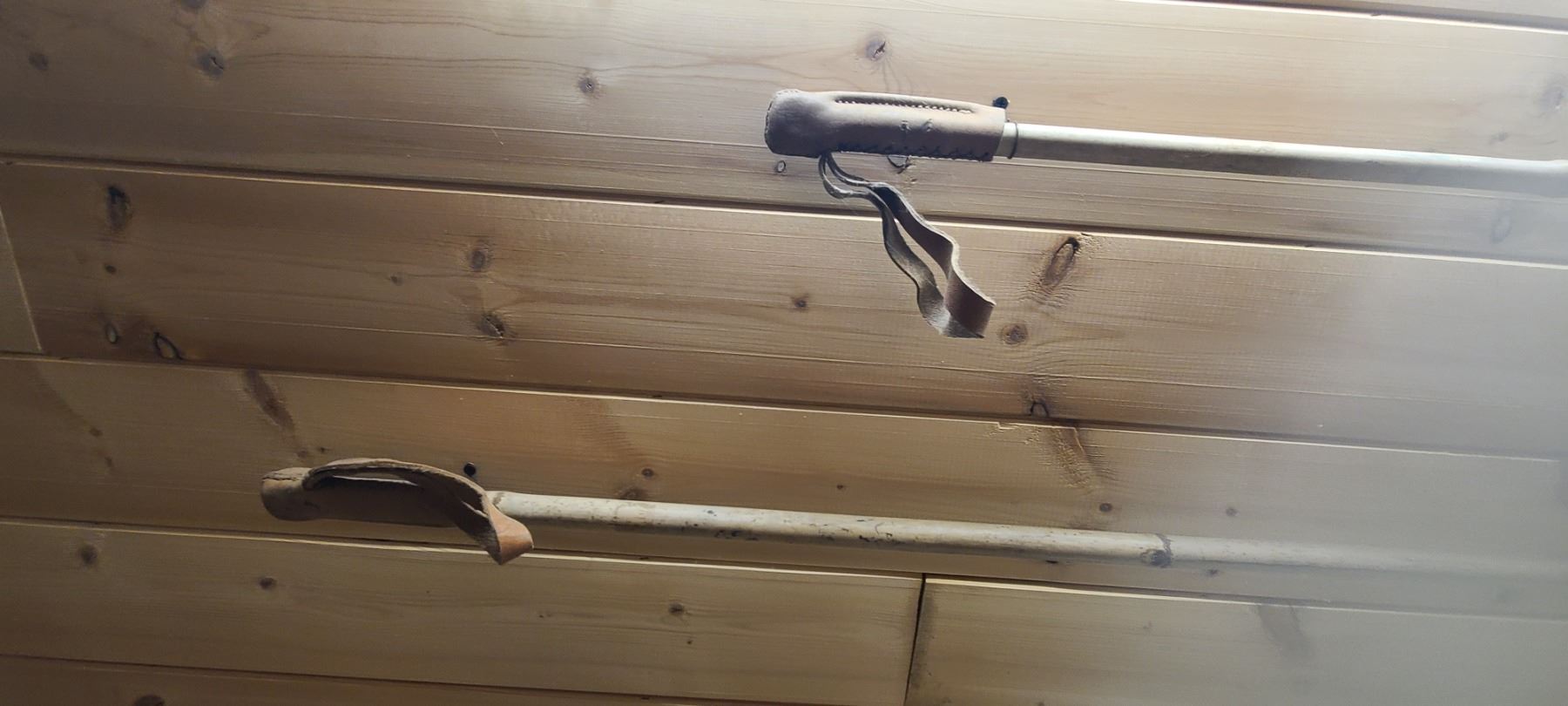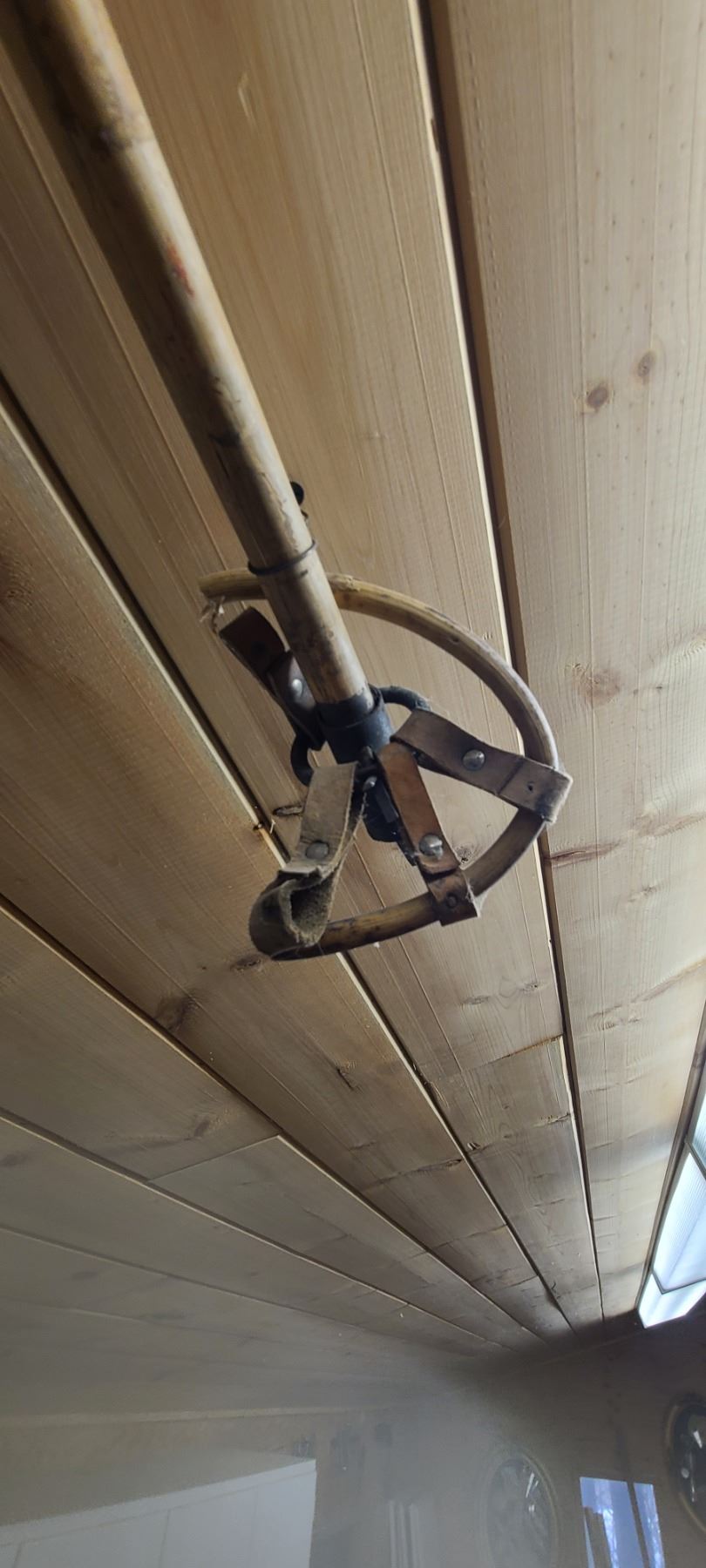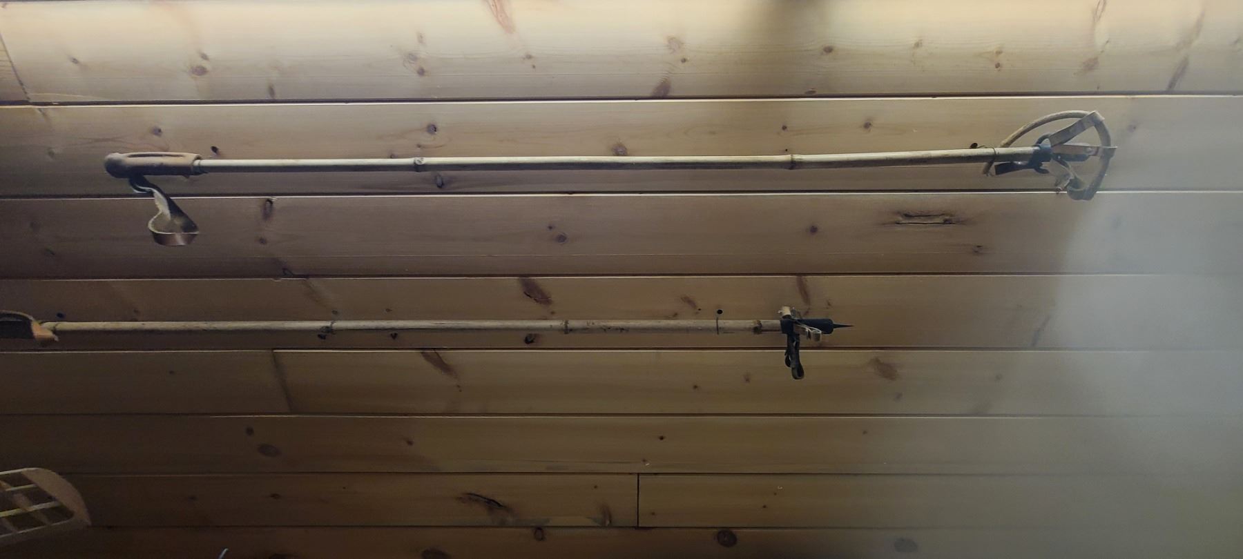 SNOW SHOES AND TWO SETS OF POLES ON CEILING