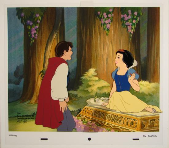 This limited edition, hand-painted animation cel set-up is from the beloved Disney movieSnow White and the Seven Dwarves (1937). This magical scene portrays Snow White awakening from an evil spell by a true love's kiss, as bestowed by her prince.