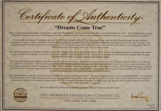 Title: "Dreams Come True" Number: Sequence 16, Scene 12, Drawing #44A/40 Medium: Hand-inked, hand painted cel on acetate; Giclee printed background on acid-free paper Sheet size: 11½ x 12¾ inches Image size: 9½ x 11½ Date of Publication: 2002 Numbered AP (Artist's Proof); originally in an edition of 4, from a series of 45 different scenes, (180 pieces in the series) Condition: Excellent Publisher's Certificate of Authenticity included