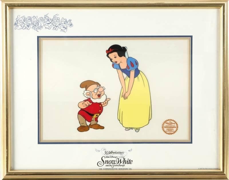 A commemorative limited edition serigraph cel of Snow White and the Seven Dwarfs (Disney, 1937) produced by the Walt Disney Company in 1987. The serigraphs were created by looking at the original artwork produced for the films. Matted and framed.