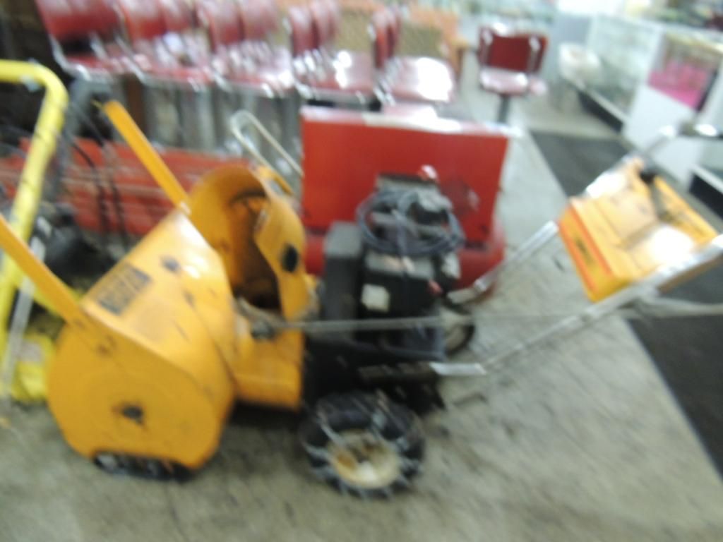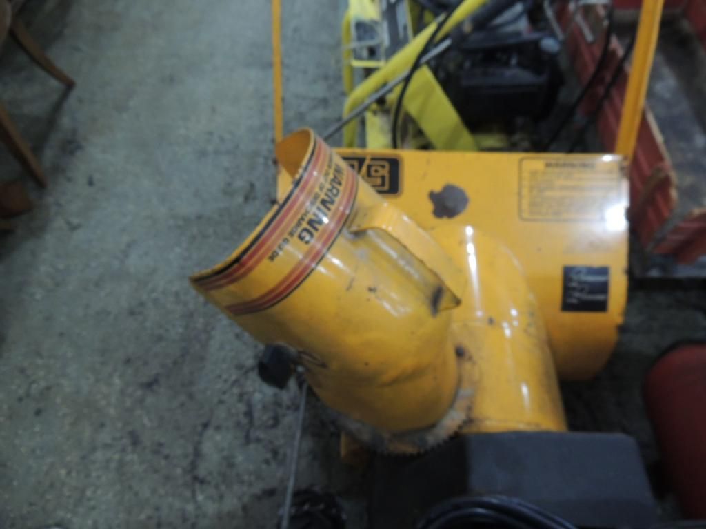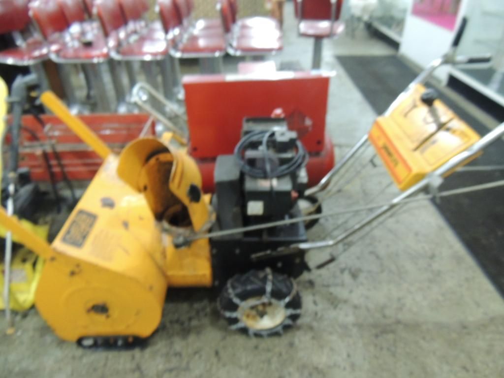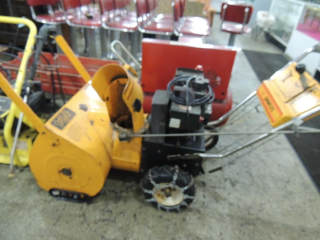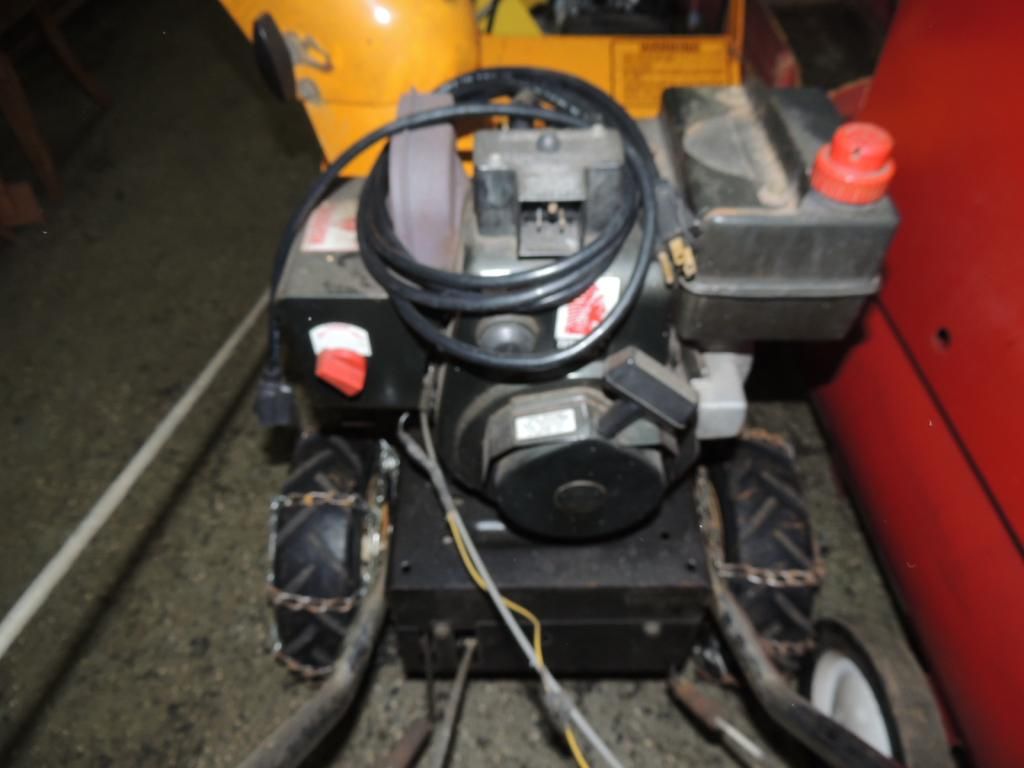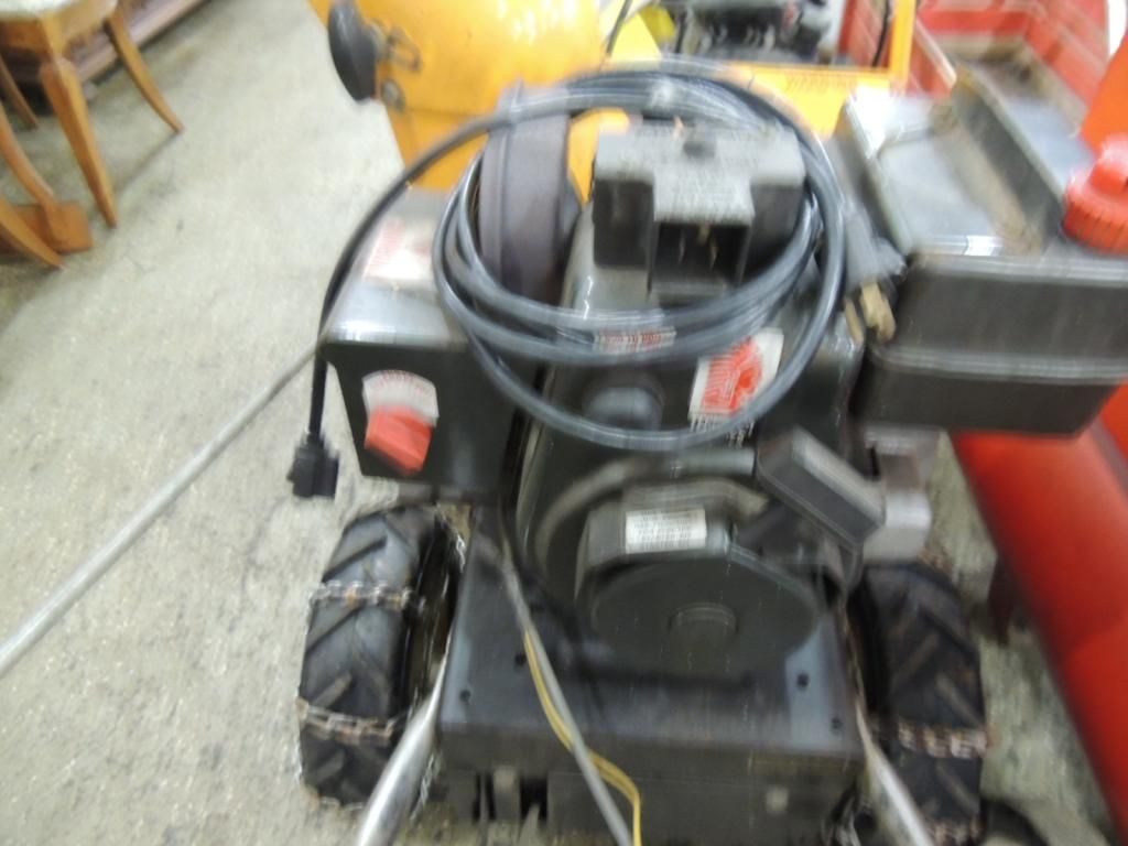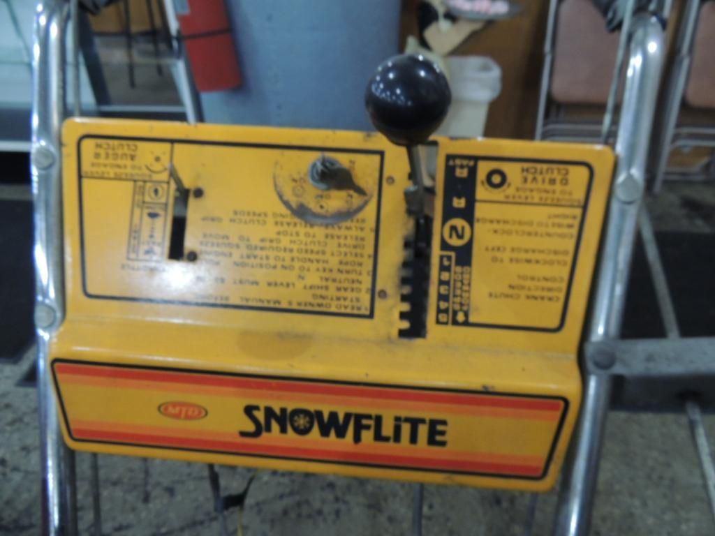 GAS POWER SNOW BLOWER. SNOWFLITE SNOWBLOWER. CHAINS ON WHEELS AS SHOWN. SEE PHOTO FOR MORE DETAILS.