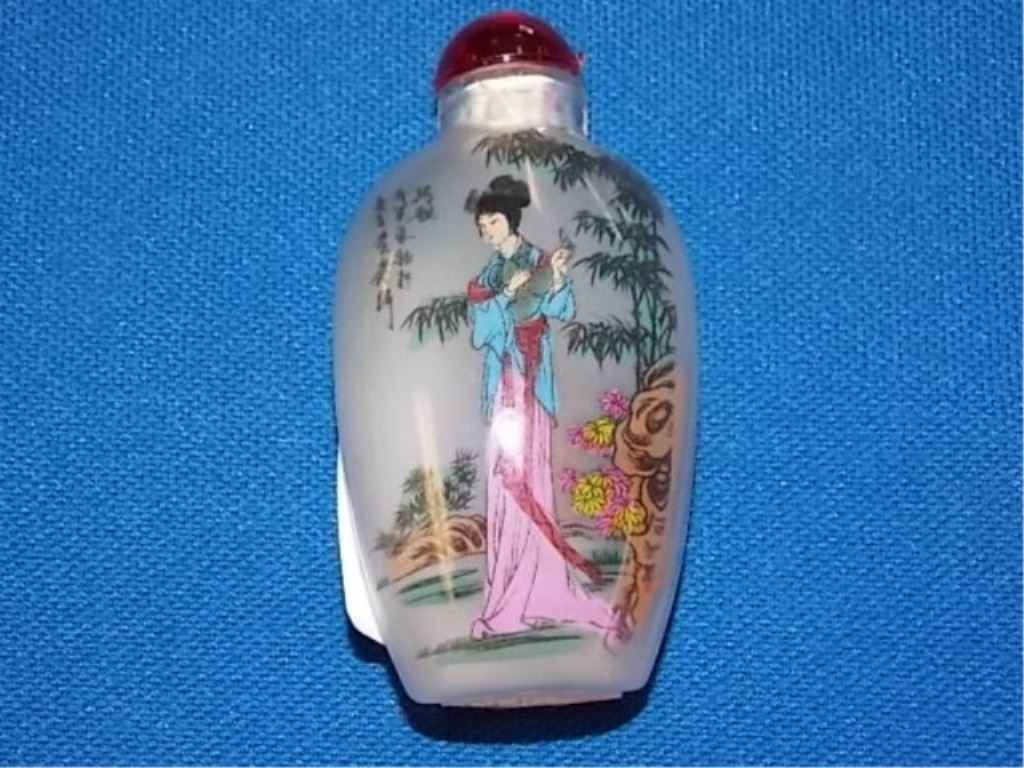 SNUFF BOTTLE - HAND PAINTED - WITH LID LADY PINK DRESS