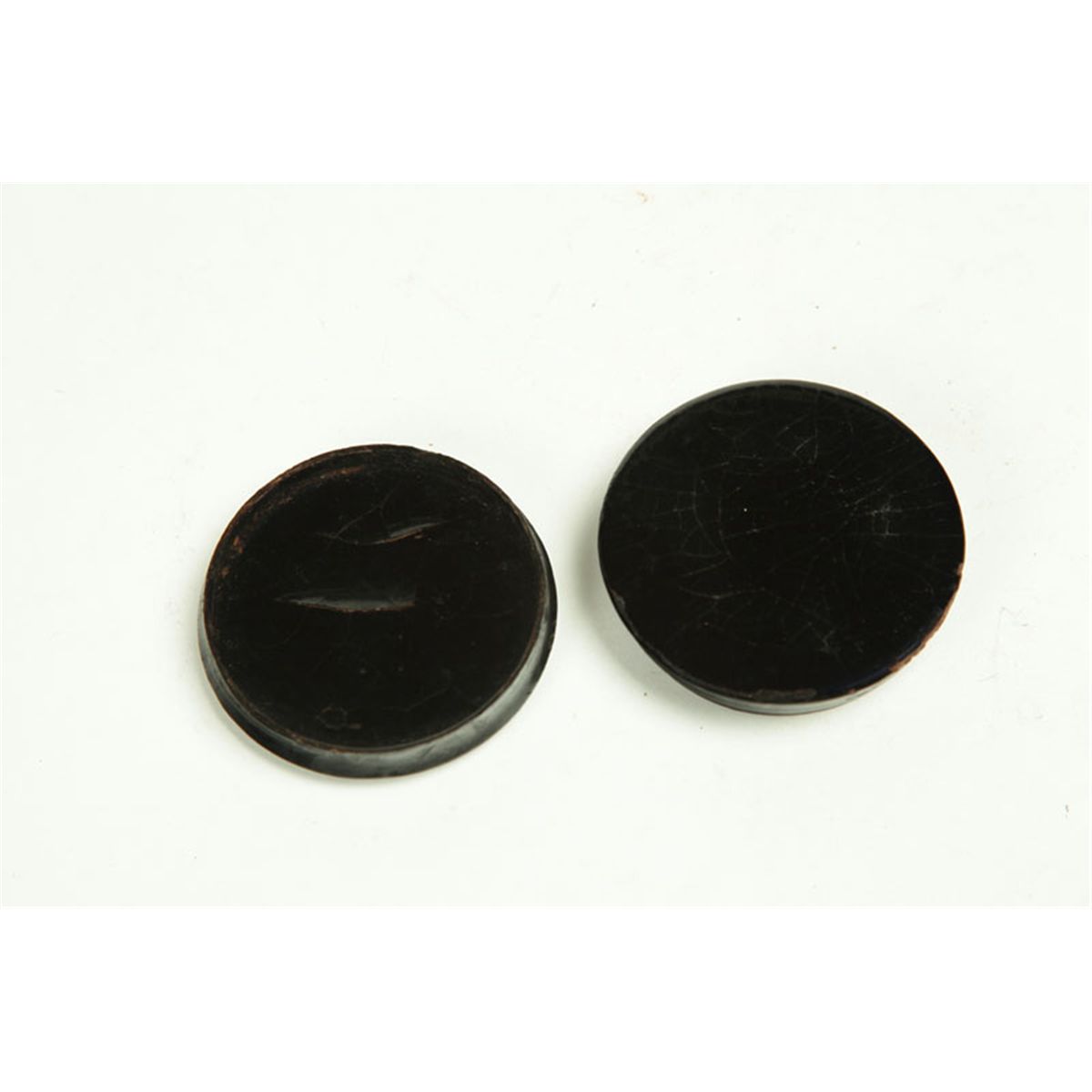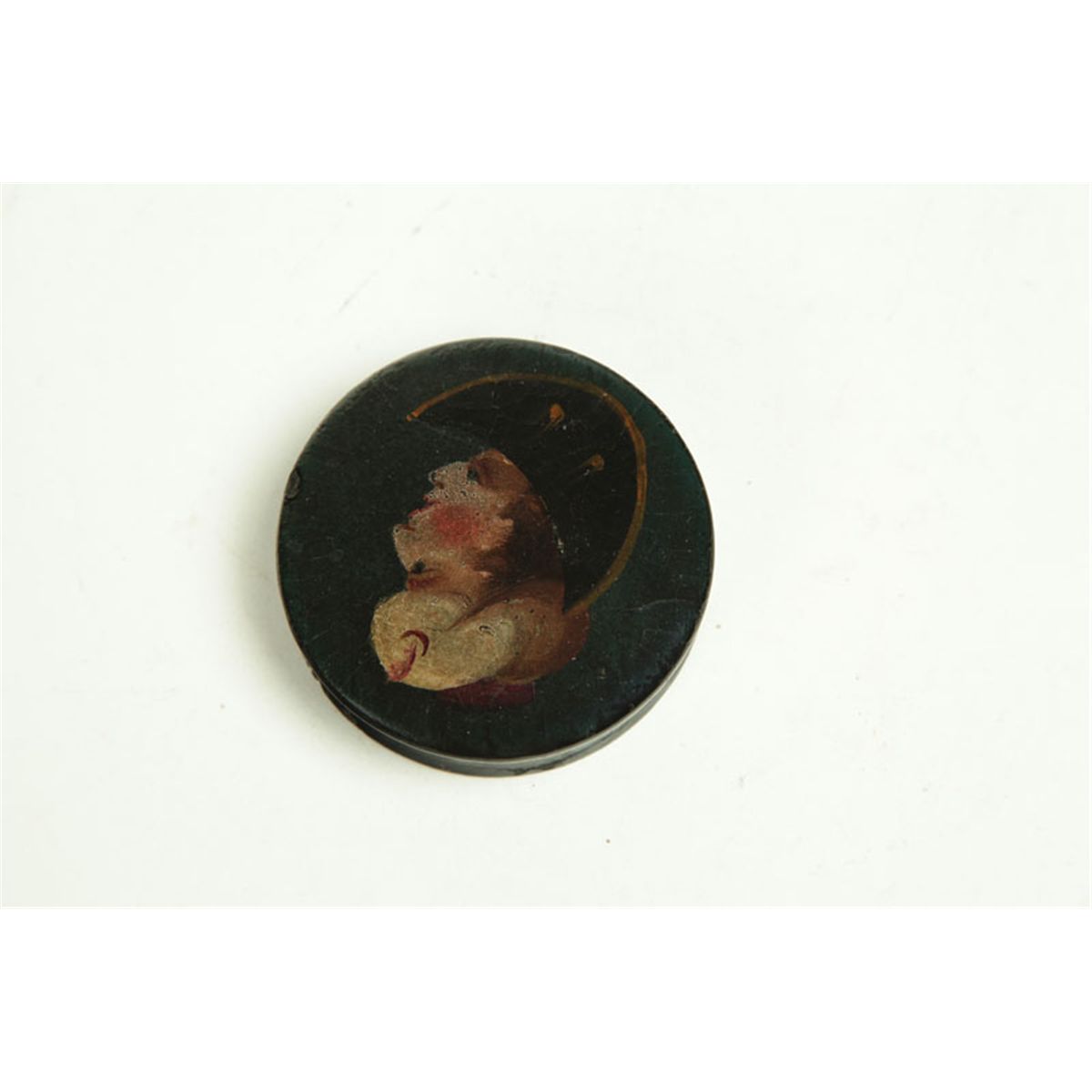 European, 19th century, lacquer. Round box, the lid with a metamorphic portrait of a gentleman if viewed one direction, and a lady if viewed from the other. Losses. 2 3/4"d.