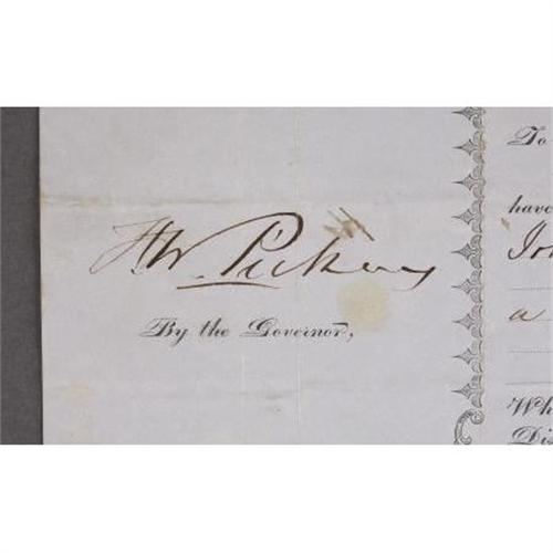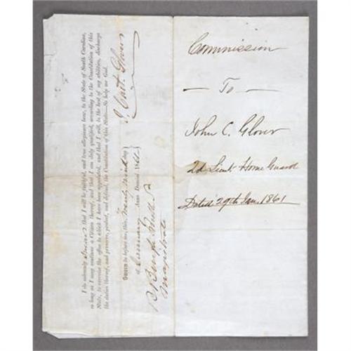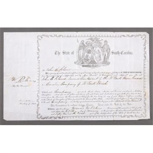 <B>SOUTH CAROLINA “SECESSION” MILITARY APPOINTMENT SIGNED BY GOV. F. W. PICKENS 1861</B></I> - Governor Francis W. Pickens - one page DS on blue paper, dated January 29th, 1861 with beautiful state seal of South Carolina at head. Commission for John C. Clover as a “2nd Lieutenant of the St. Paul’s Home Guard, a cavalry company of St. Paul’s Parish.” Boldly signed, F. W. Pickens” Governor, and “Isaac H. Means” Secretary of State. On verso is lt. Glover’s signature at bottom. A very rare piece of South Carolina history dated just one month after the state seceded from the Union, which initiated the Civil war. 14” x 8.50”. <BR><BR><BR><B>Condition:</B></I> Fine, some small tears in folds<BR><BR><BR><b>Shipping:</b> Miscellaneous Collectibles, Smal (<a target="_blank" href="http://www.heritageauctions.com/common/shipping.php">view shipping information</a>)