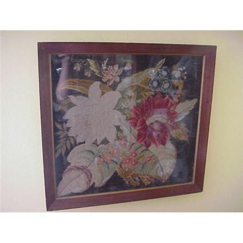 So chic is this beautiful Victorian needlepoint ROSES and flowers needlework picture framed in its original rich rosewood frame. This is a gorgeous item with lush florals on a black background. The colors are rich, just the glare from the glass gives a lighter appearance, if you look at the shadows on the glass you will see the actual beautiful colors in the flowers. It measures 18 ½ inches by 17 ½ inches, in very nice all original condition. It dates from about the 1880-90s, a true lovely Victorian example of needlework, the stitches are minute and exceptionally fine. If you love antique lace and linens, all things shabby chic, romantic cottage along with roses, barkcloth, limoges, then you may wish to bookmark our listings!