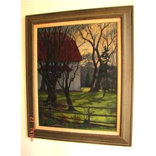 Oil on Canvas of Landscape in Midwest of a House in the Country behind a fence and many large trees. This painting is signed by Line Bloom Draper won a award in 1970--Annual P.C. Honorable Mention. This information is written on the back of the canvas along with the artists name and her address of 4210 Corey Road--Toledo, Ohio. The painting is also signed in the lower right of this nice subdued painting. THhe canvas measures 24" X 30" and the dimensions of the frame is 32" X 39". The artist is listed in WHO WAS WHO IN AMERICAN ART. The artist was born in Verviers, Belgium. She apparently moved to the United States at a young age as she is listed as a American Artist.
