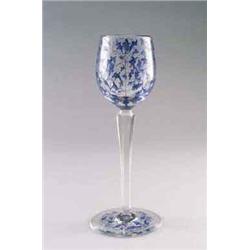 SOC. ANON. VEDAR - VETRI D'ARTE FONTANA Mailand Weinglas, farbloses Glas, blaue Emailbemalung von Blättern auf dem Tellerfuß und auf der leicht bauchigen Kuppa, der Stiel facettiert. H. 20,5 cm. Bez.: Firmenmarke Vedar (gemalt). 1920er Jahre