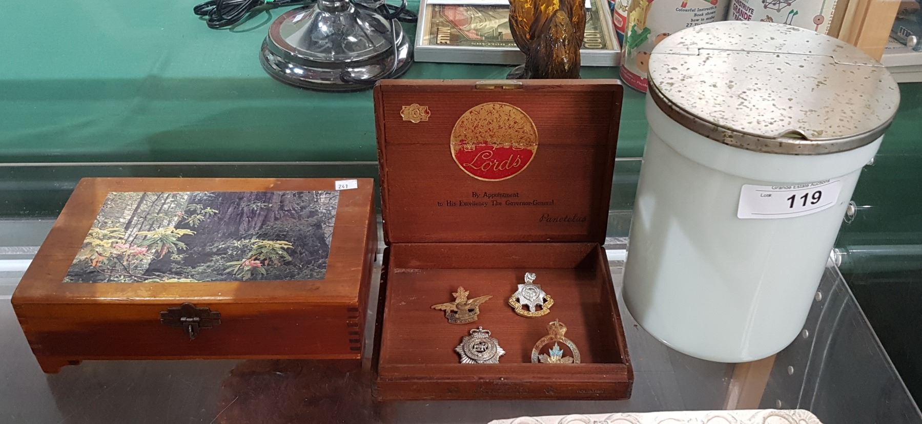 SODA SHOP CANNISTER, 2 VINTAGE WOOD BOXES W/MILITARY BADGES