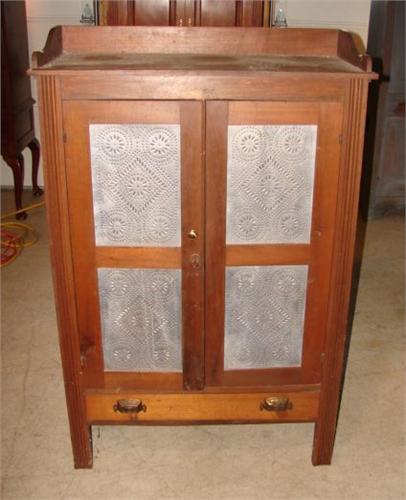 SOFTWOOD 10-TIN PIE SAFE. Has single drawer at bottom. Has 10 pierced tins & brass pulls. Has dovetailed galley at top. 53” H to top of galley, 35” W, 17” D