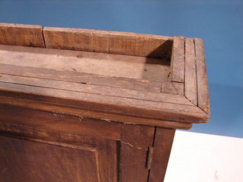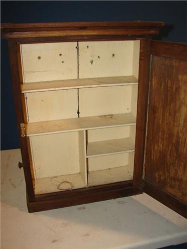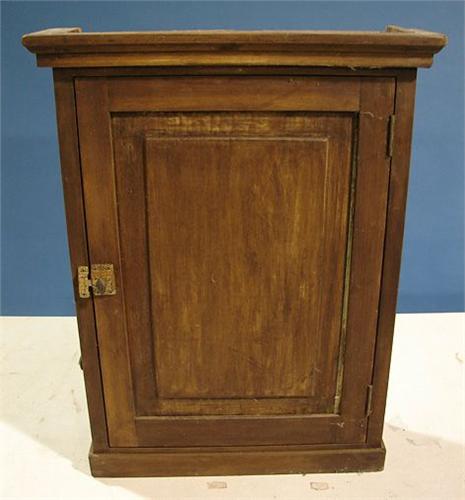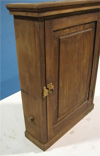 SOFTWOOD HANGING MEDICINE CABINET. Single raised panel door. Cornice at top. Has fitted shelf interior. 25.5” H, 19.25” W, 6.5” D