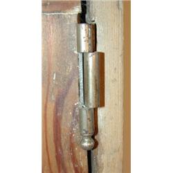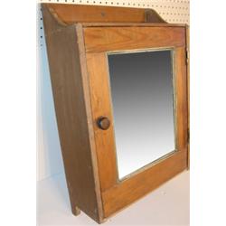 SOFTWOOD MEDICINE CABINET WITH MIRRORED DOOR. Top hinge is damaged. Shows signs of wear. 25" H, 17.5" W, 7" D