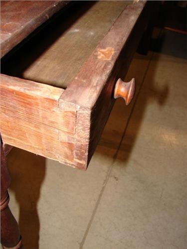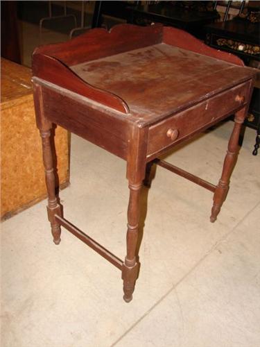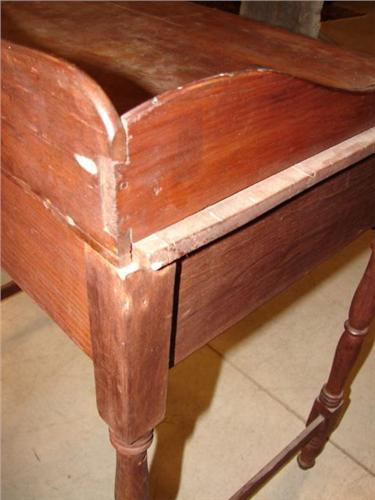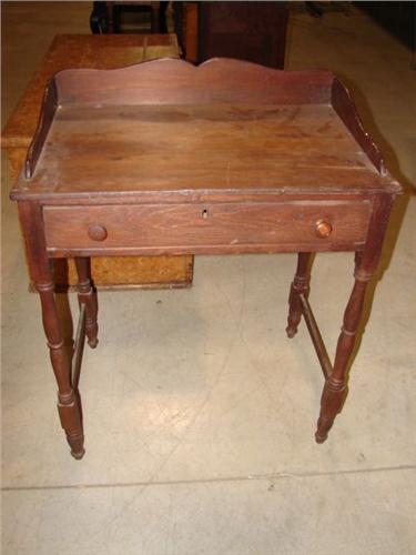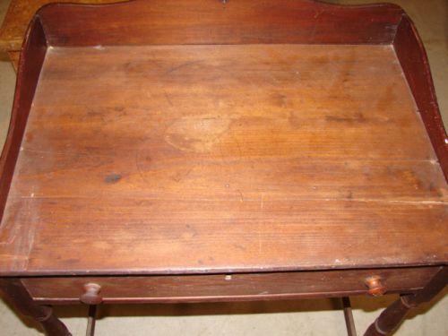 SOFTWOOD SINGLE DRAWER WASHSTAND. Has single dovetailed drawer and dovetailed cut-out galley at top. Turned legs. 32.5” H, 27” W, 18” D